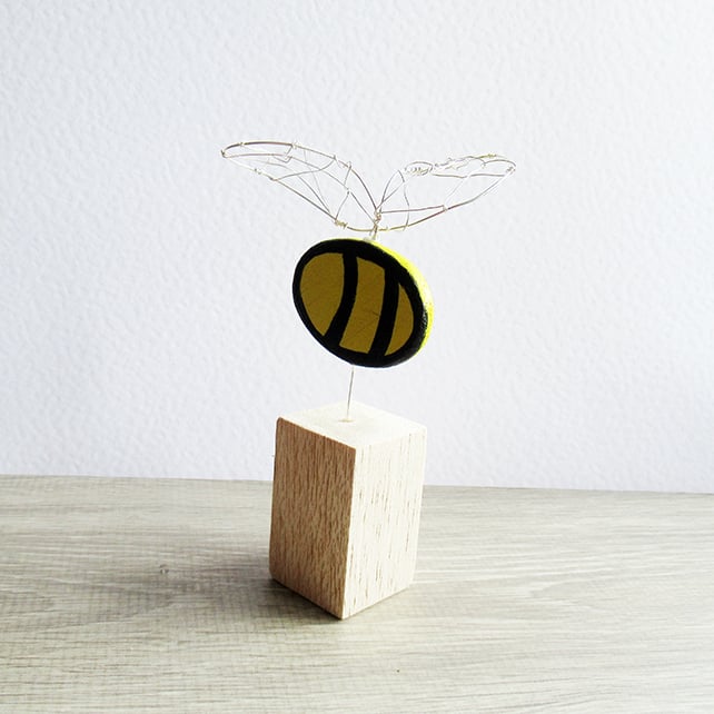 It has distinctive bee stripes painted with acrylic paint in yellow and black and sculpted wire wings complete this striking ornament. The reverse of the bee has been painted and gives the impression that's it's happily flying. Gift idea for a bee lover or nature lover.