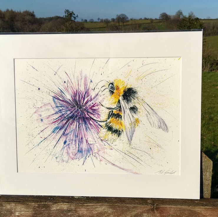 An open edition signed high quality print of an original painting of a bumblebee. The original is mixed media. Each print is professionally mounted and cellophane wrapped.