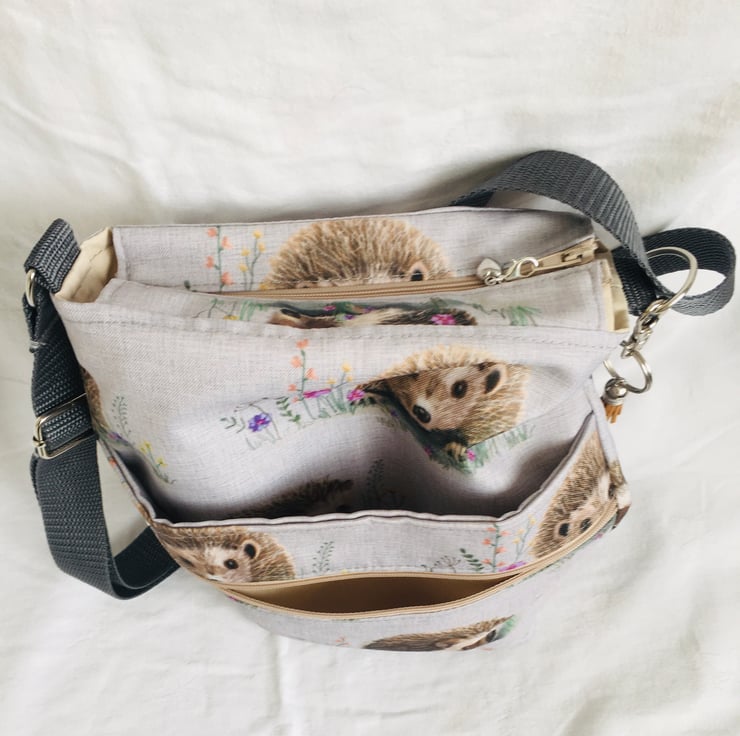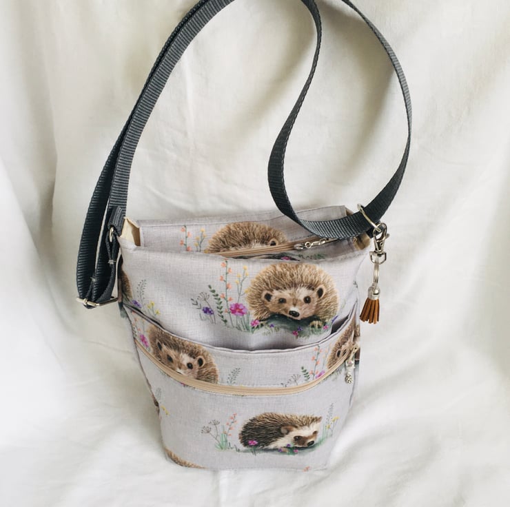 This is the cutest exclusive crossbody bag, in an adorable Hedgehogs print on light grey background water resistant fabric, and fully lined with a plain cotton fabric, which has been backed with a foam stabilizer for stability and strength. A great little bag for the quick trips out, or when walking as this bag has plenty of room for a purse, keys, phone and even your glasses.