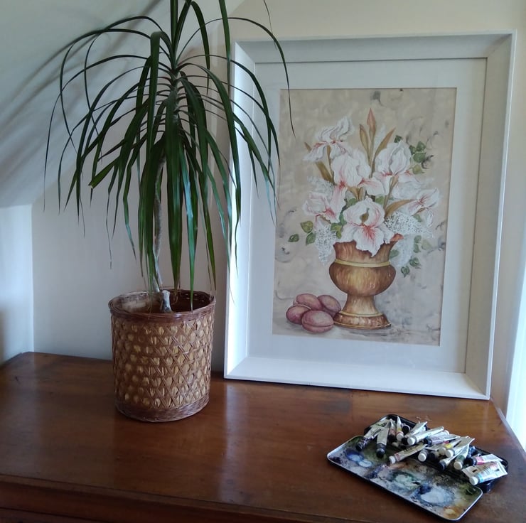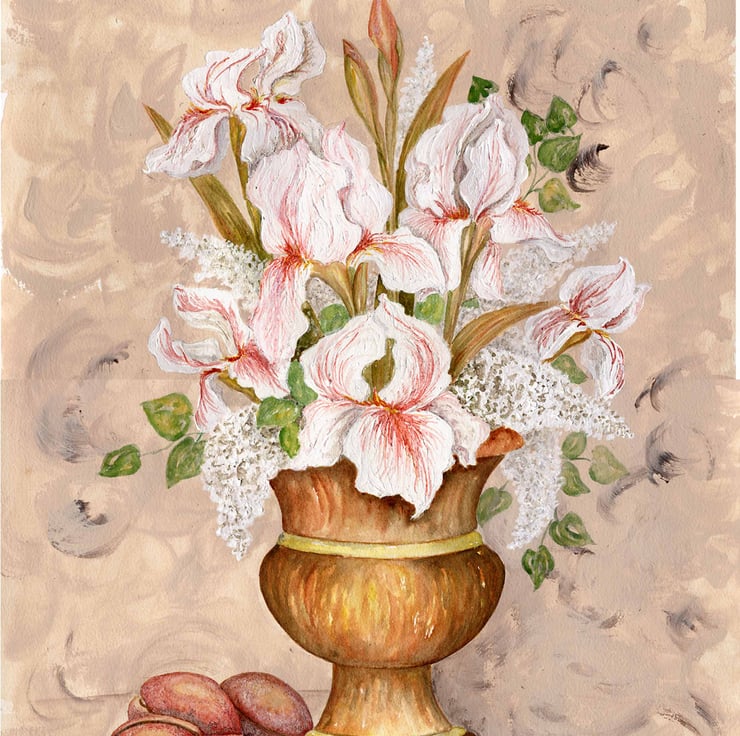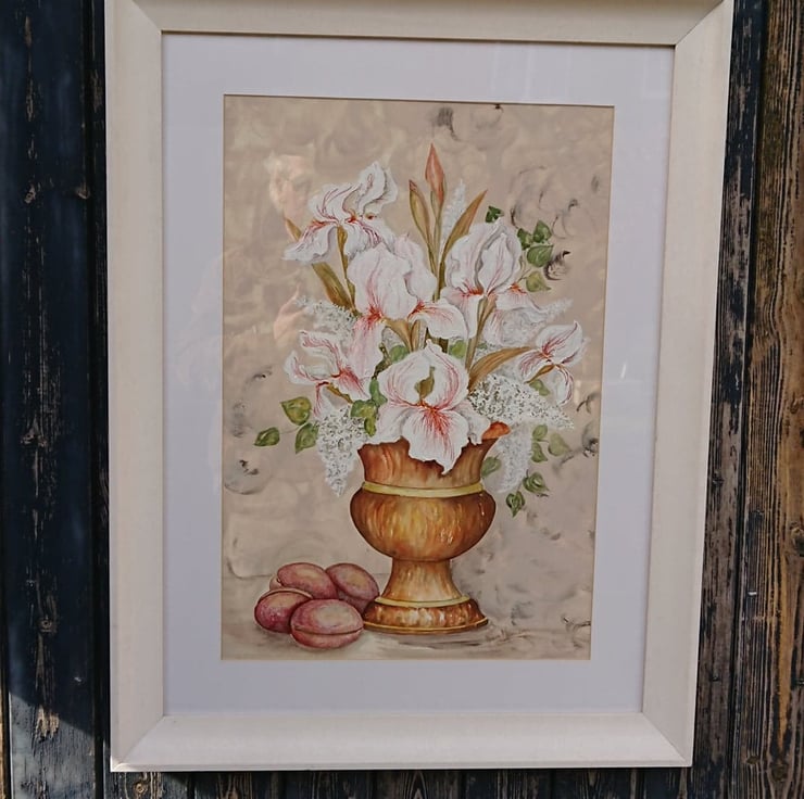 An original painting of white irises and lilac arranged in a copper urn with 4 plums nestled at the base. I have used gouache for body on the flower heads and watercolour for leaves and floral detail. The copper coloured urn is in watercolour as is the soft, muted creamy pink and sepia tones of the background. It was created in my Norfolk studio. The painting is mounted and elegantly framed in lime-washed wood which is ready to hang. The overall measurement is 72cm x 55cm and the internal image is 52cm x 35cm. Add a touch of class to your living space or give as an original copper wedding anniversary present. I have called this one 'Iris and plums'.