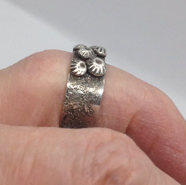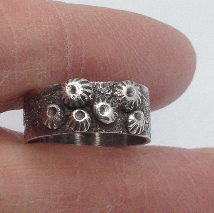 Sterling silver band ring aged and encrusted with the addition of silver barnacles. A nod to the adventures of Simon Bourne and the Hovercraft History Hunters in the Thames estuary. Wear one on your 'pinky' or even your thumb. Just let me know your UK or US ring size via Options.