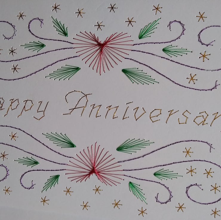A lovely anniversary card hand embroidered in green, red, mauve and gold metallic thread on a white card. The mauve insert has been left blank for your own message.