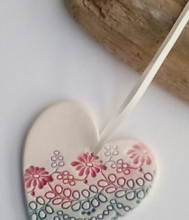This beautiful ceramic heart is imprinted with a flower design and glazed with a range of colours from burgundy and purple flowers to blue and teal in the leaf pattern.