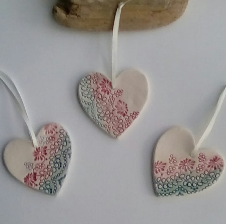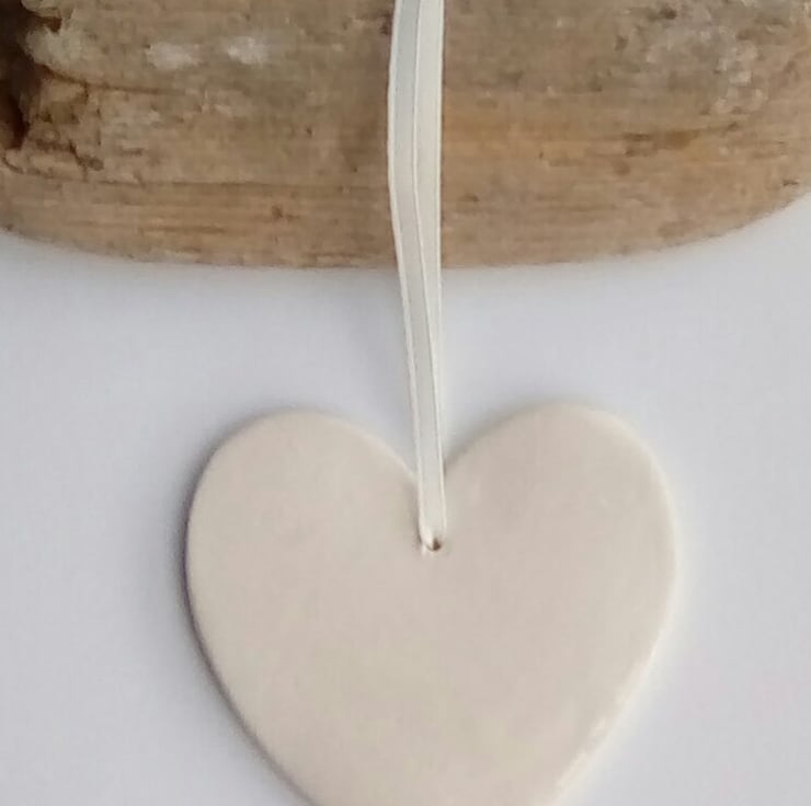 The heart is approximately 6.5cm by 6.5 cm and hangs from an ivory coloured satin ribbon.