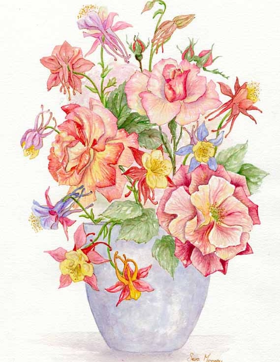 My friend Ken has the greenest of fingers so when I need really top quality flowers to draw, I head to his garden. I might get a gin and tonic too, if I'm lucky. As all my paintings start with a sketch I had to name this one after him and include his beautiful aquilegia as well. I chose a simple pale blue pottery vase for this arrangement which means it could be a unique 'Pottery Wedding anniversary gift'. It's for 9 years!. I felt there was so much going on in the composition, I left the paper white, I hope you approve.