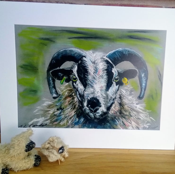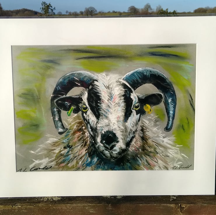 A quality print of an original pastel drawing of a Badger faced Welsh mountain sheep. Each print is professionally mounted and cellophane wrapped.