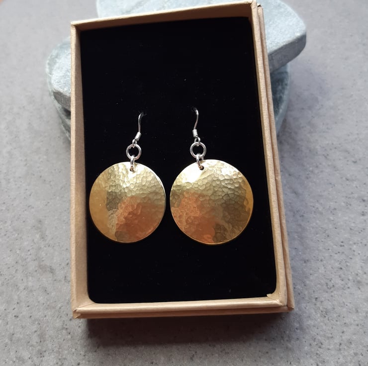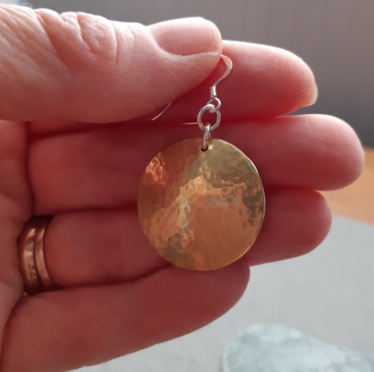 Large brass disc's which have been cut from a sheet of brass have been hammered to give texture, slightly domed, polished and tumbled The brass discs are then attached to sterling silver ear wires with sterling silver jump rings.