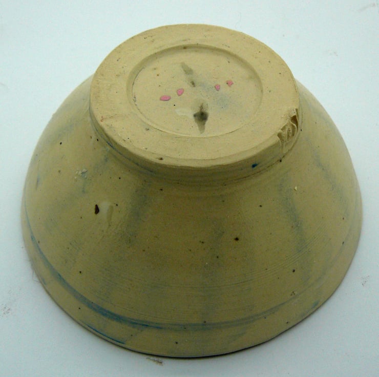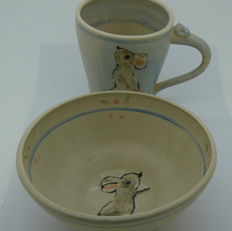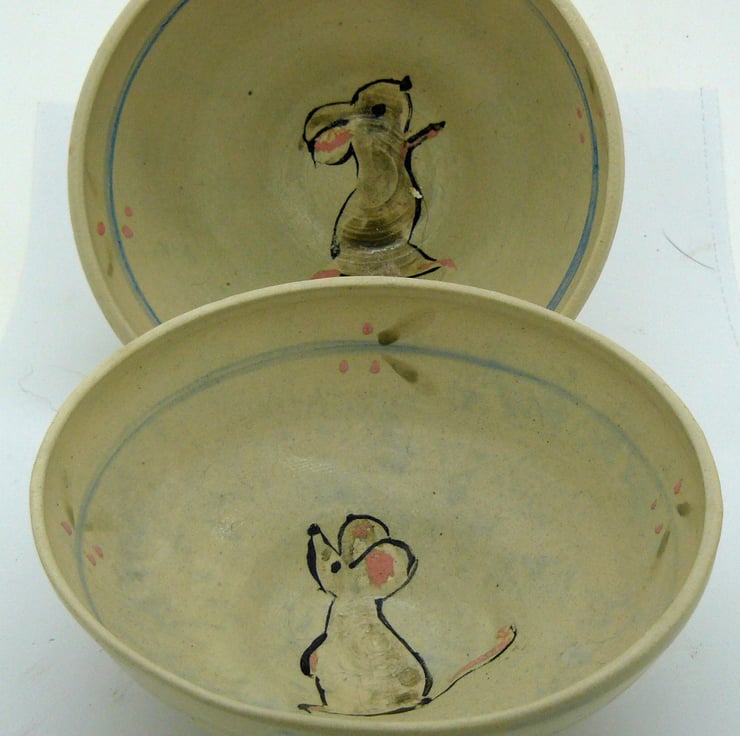 Thrown on the wheel & later hand decorated with Mice. I draw onto newspaper, then paint this with coloured slip & apply to the damp pot. I then sponge over turquoise slip & peel off the newspaper & touch up each drawing. Approx 6 x 13cms. Each mouse is slightly different. Fine for dishwasher as high fired to stoneware.