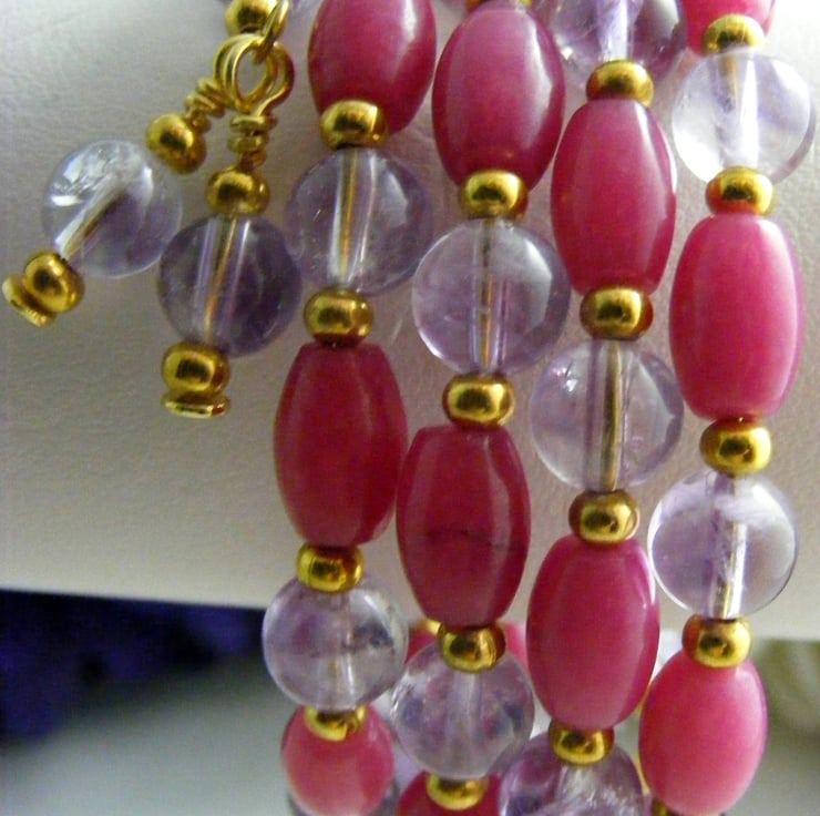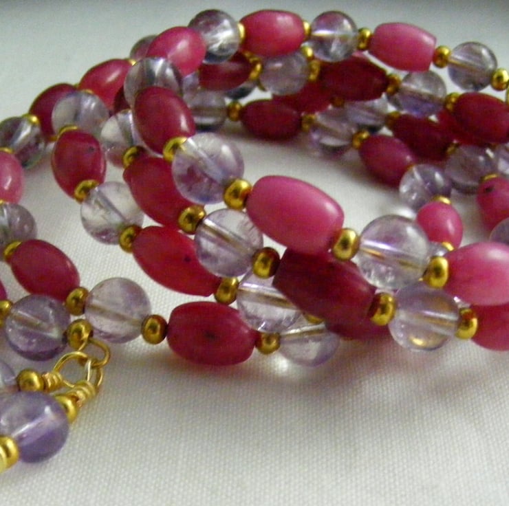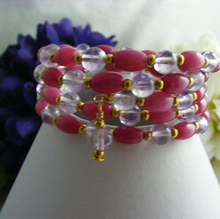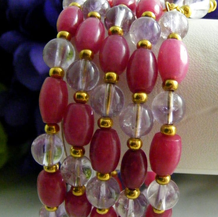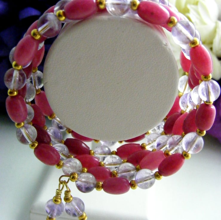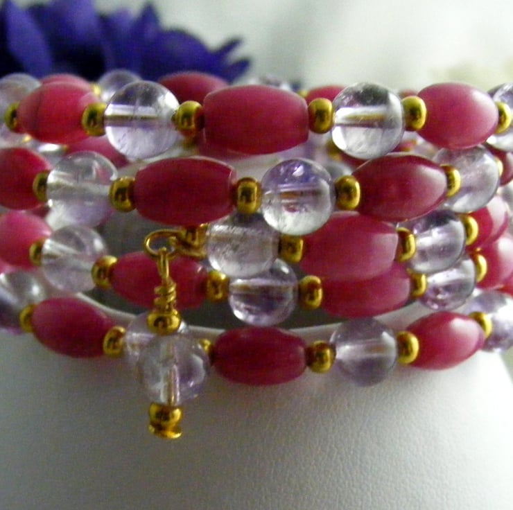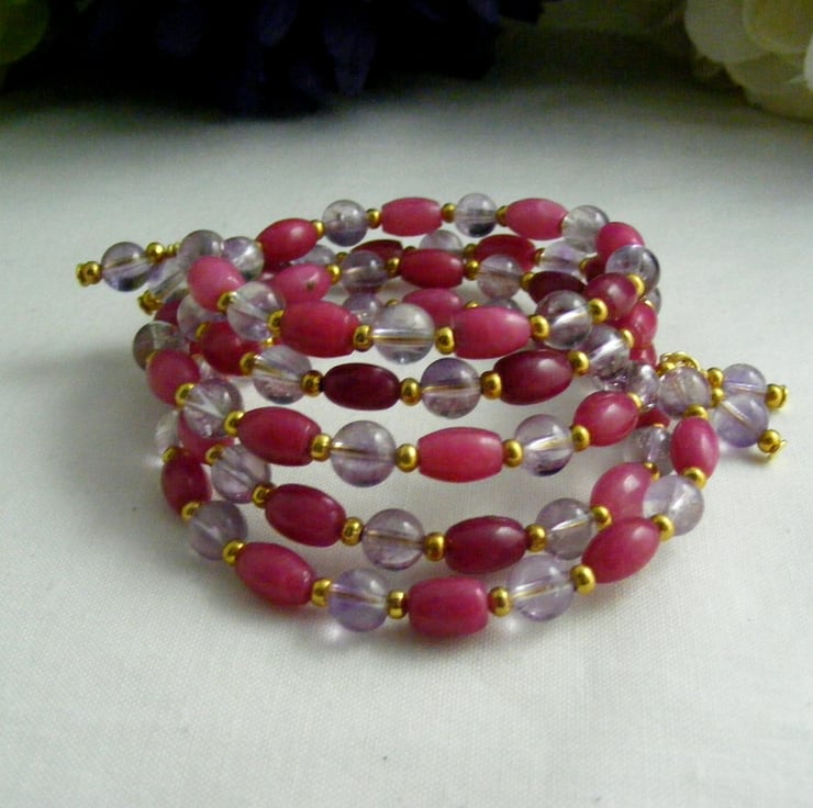 I've handmade this pretty gemstone bracelet by threading, 8 mm lavender amethyst gemstone rounds, 8 x 5 mm fuchsia gemstone barrels and 3 mm gold plated spacer beads onto 4 loops of gold plate memory wire. Ends of wire are looped and I've attached