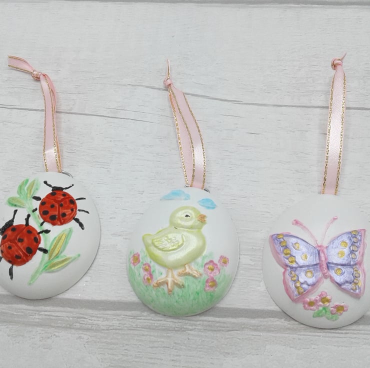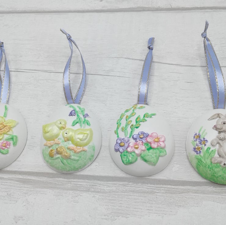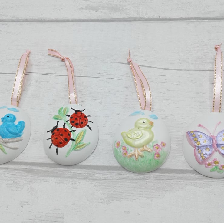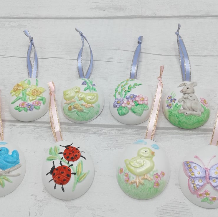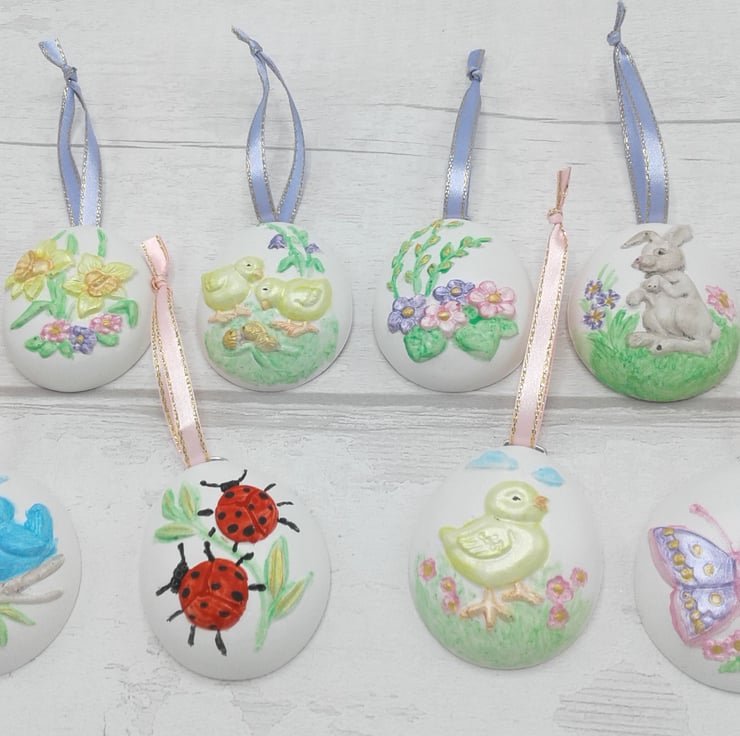 Add a special touch to your Easter/Spring decorations with this set of 8 hand painted ceramic decorations.