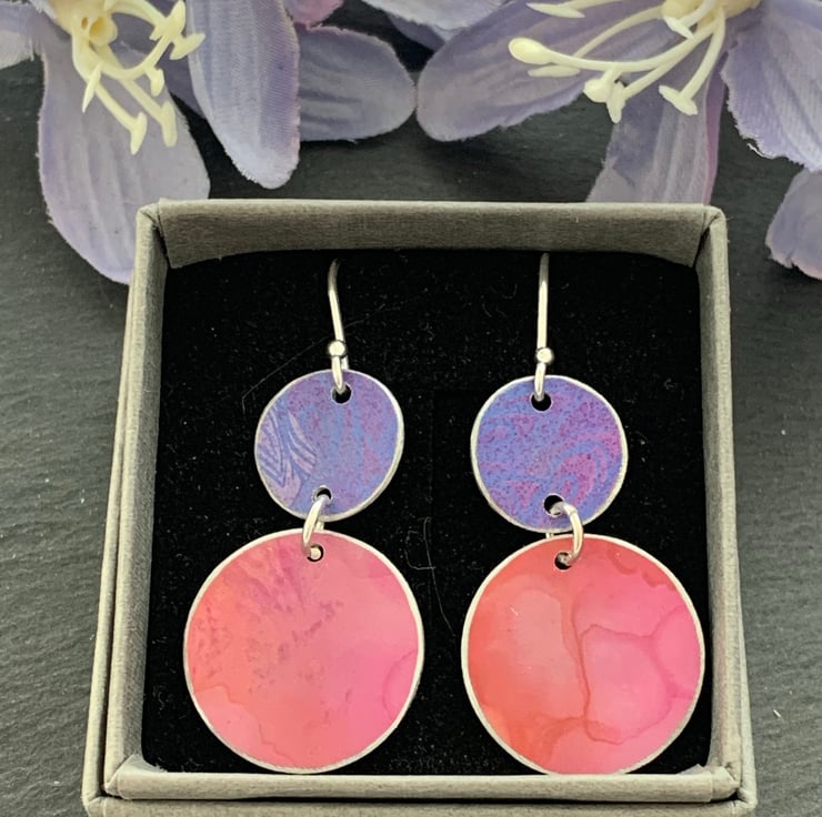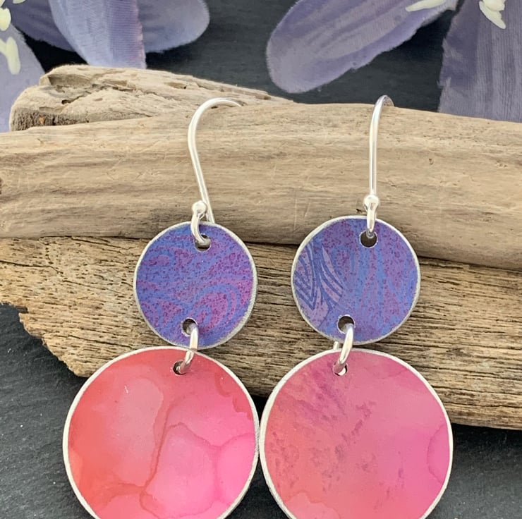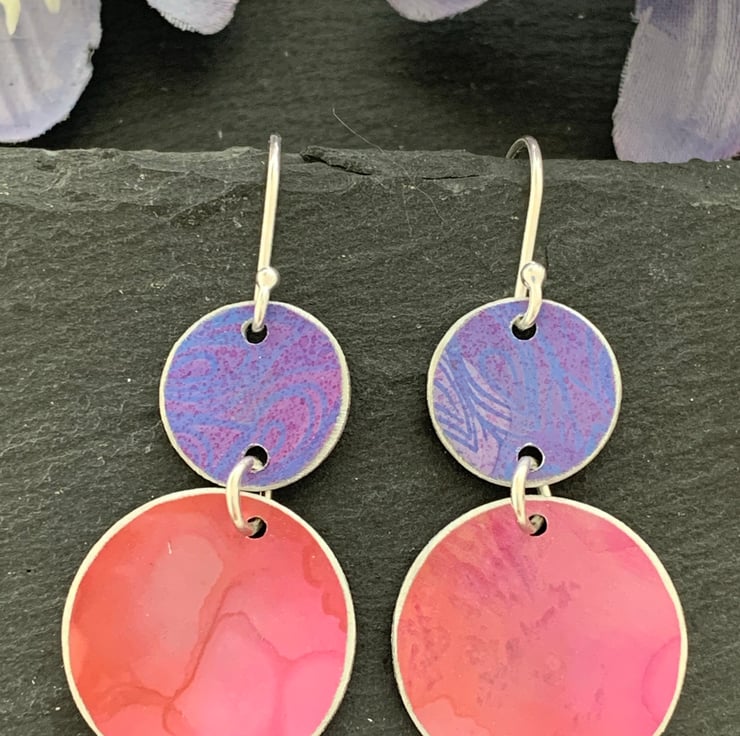 These earrings are made with a hand dyed/printed aluminium and sterling silver hook ear wires