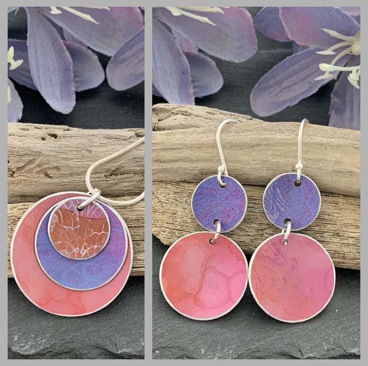 There are 2 aluminium discs- the lower/larger discs have been dyed a a lovely soft orange/pink colour. The upper smaller discs are purple with a very subtle dark pink print. Both discs have a slight curve.