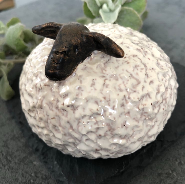 A ceramic sheep made in a white earthenware clay, and glazed with a glossy speckled ivory body and iron oxide head.