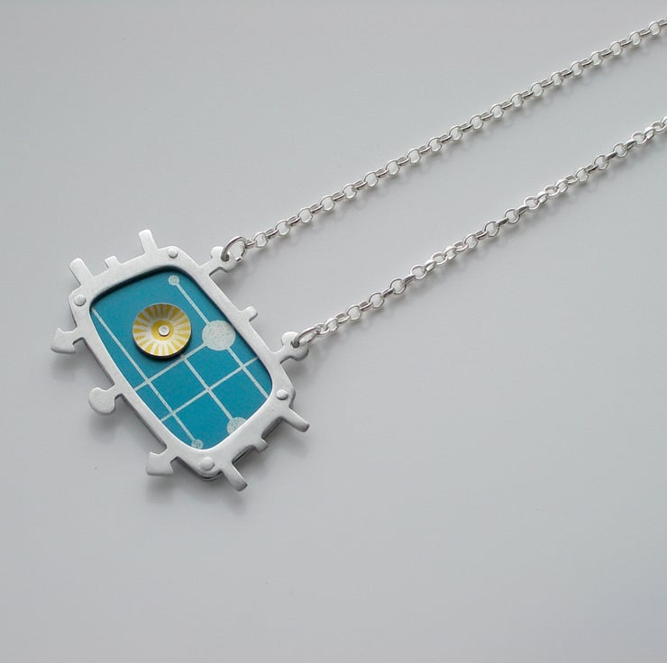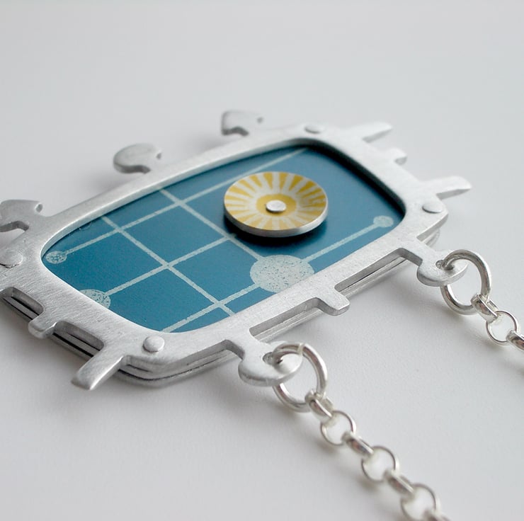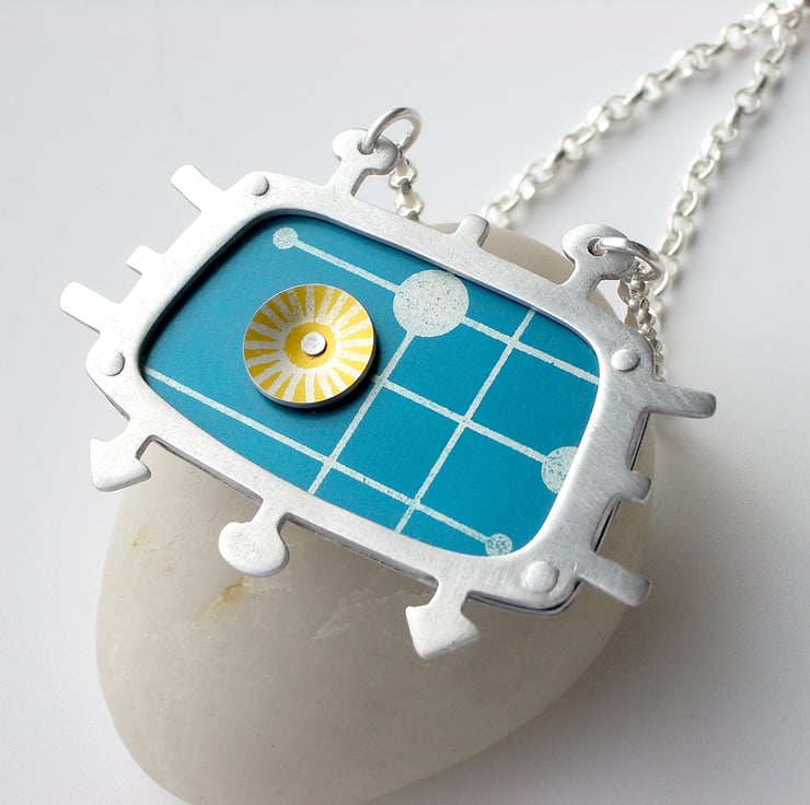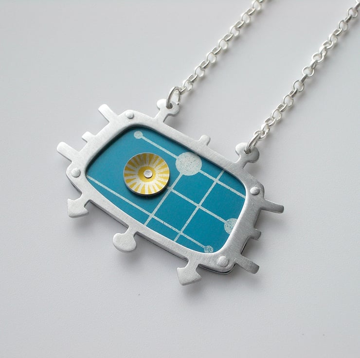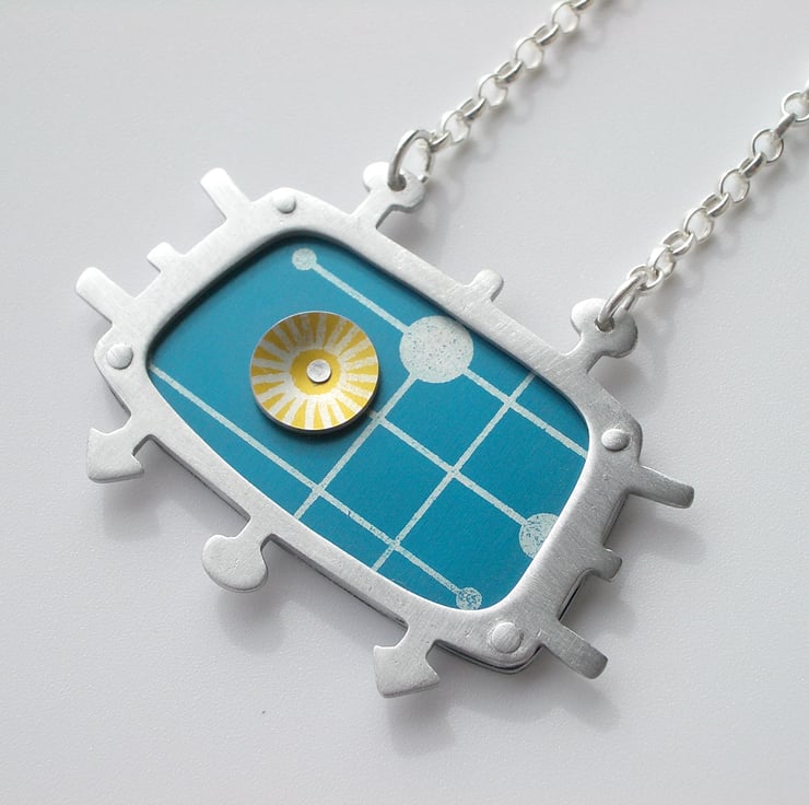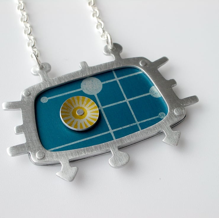 This unique mid century style rectangular necklace is made from hand dyed anodised aluminium and framed with brushed aluminium. I have dyed the patterned piece in teal and printed with a silver mid century modern pattern, adding a yellow striped disc to give a pop of colour. I have made the frame from aluminium which I have saw pierced by hand and filed to give a nice smooth edge. Finally there is a plain rectangle of brushed aluminium on the rear of the piece and all three pieces are held tightly together by hand made aluminium rivets.