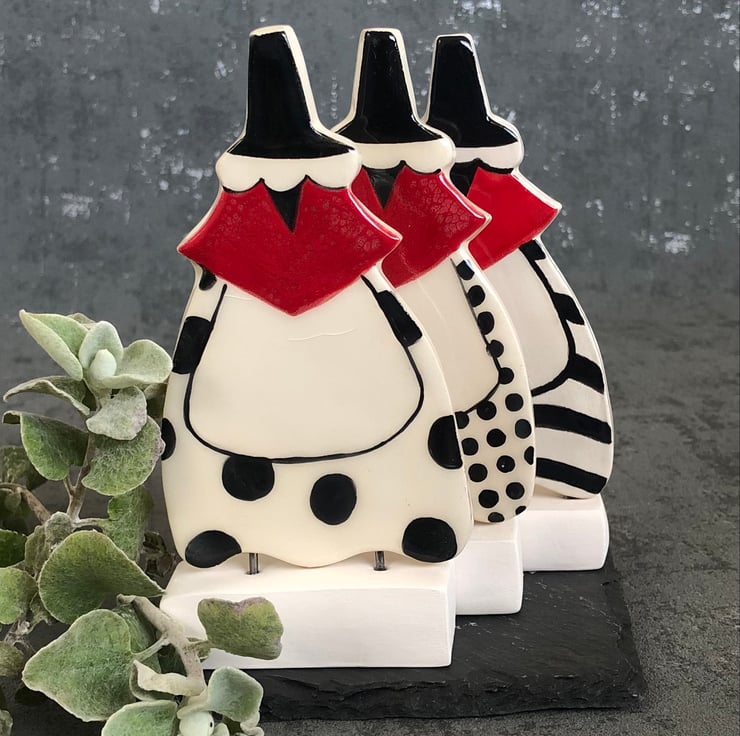 A ceramic Welsh lady, made in a white earthenware clay and glazed in traditional red and black with a uniquely patterned skirt.