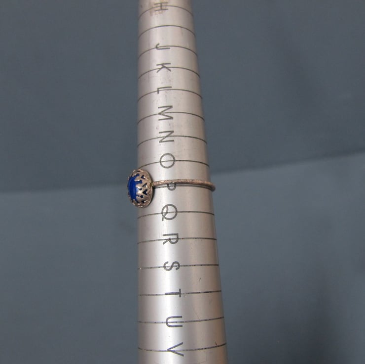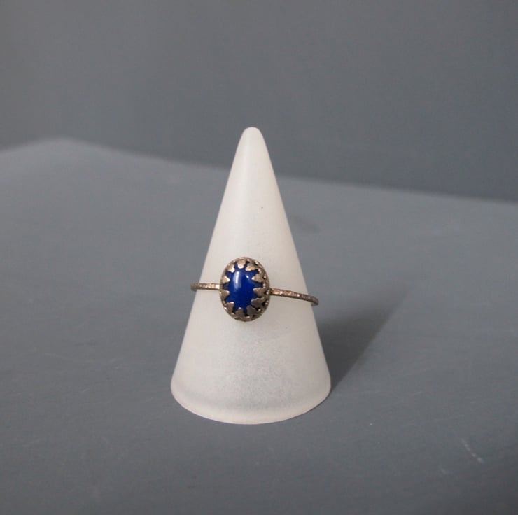 The rich blue gemstone is set into an elaborate decorative and detailed setting and sits on a heavily textured hammered silver ring band.
