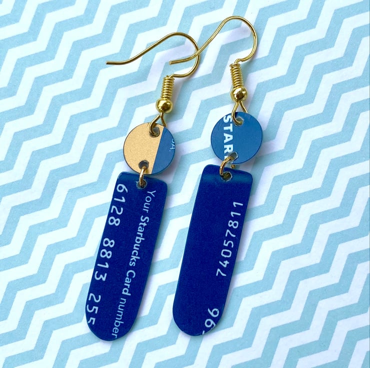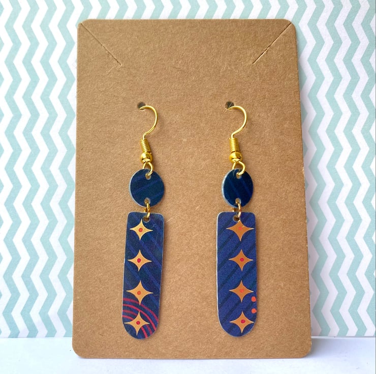 These earrings originated from a plastic store gift card. A small disc and oblong shape have been cut out by hand and joined with a gold coloured ring. Featuring gold stars/diamonds and red stripes and spots on a striped blue background, they are super lightweight to wear.