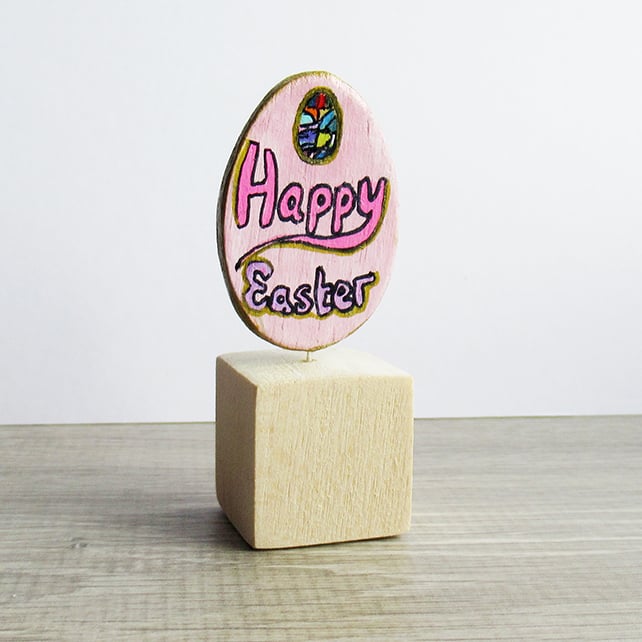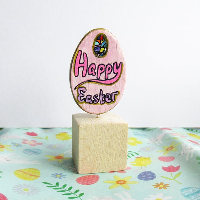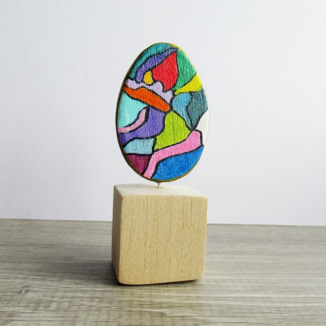 This marvelous little wooden hand-carved and hand painted egg decoration / ornament has an abstract art design in multiple colours on one side and 'Happy Easter' text on the other with a little mini egg version of the reverse design and a gold painted edge. It has been painted with acrylic paints and is attached to a wooden cube by silver plated copper wire. A lovely item to treasure and bring out each Easter or a delightful gift idea for a friend or family member.