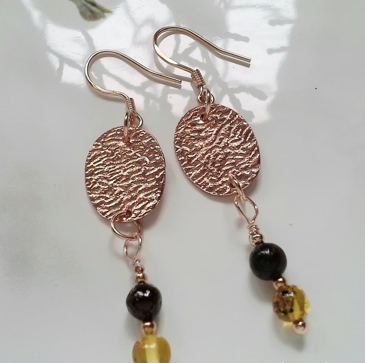 An opulent pair of earrings designed and hand crafted in Cornwall for all age groups and skin tones, complimented with all rose gold vermeil (over 925 sterling silver) components. The baltic amber 5mm cut rounds have beautiful natural warm golden honey colours and they have not had any specialist treatments applied to enhance them. The stamped textured ovals are15mm by 12mm , making these earrings very striking and totally unique for the recipient wearing them.