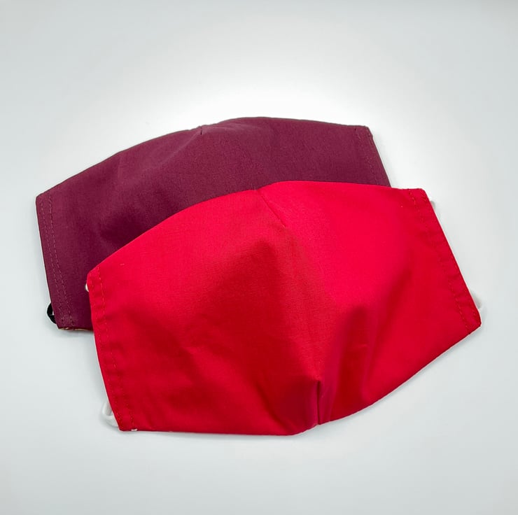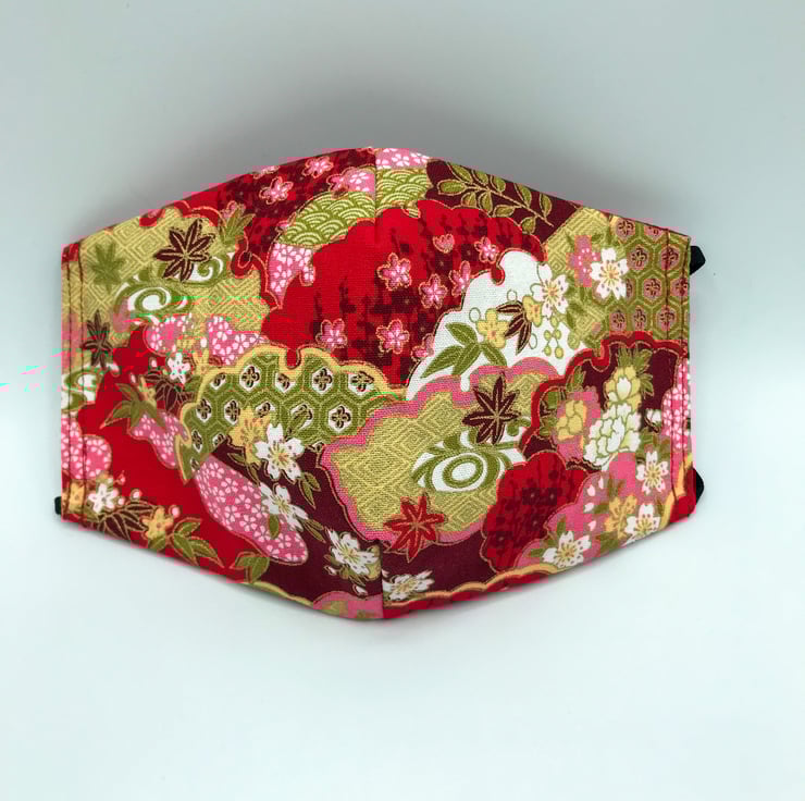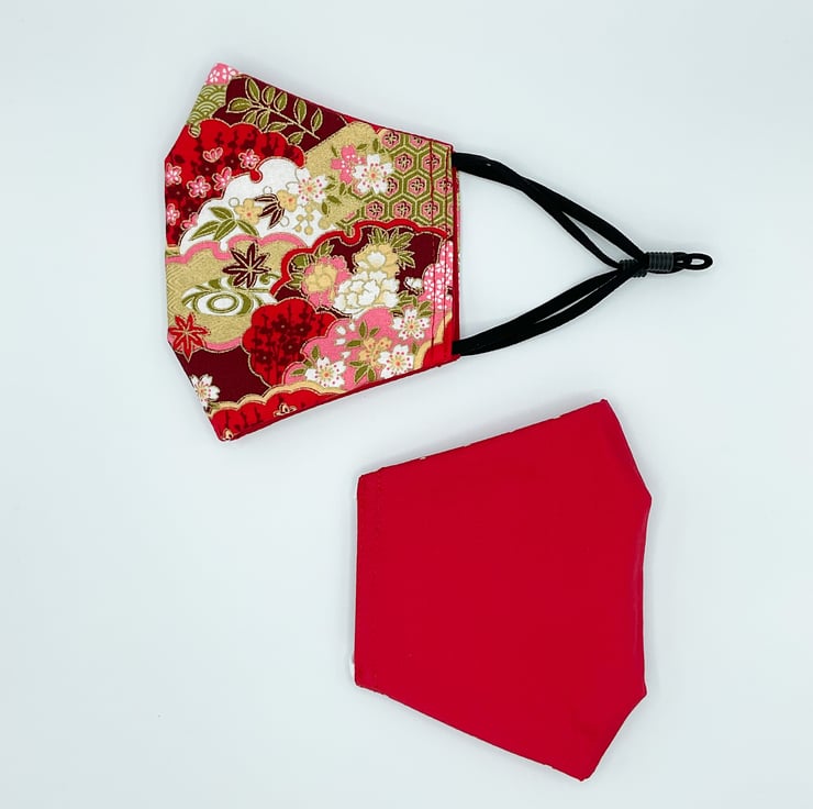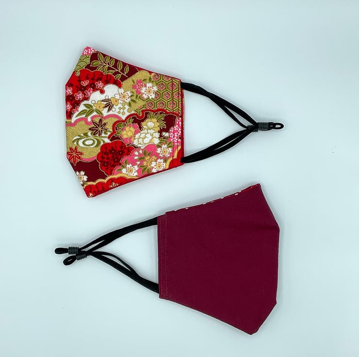 This is a double sided face mask, made from a red Japanese style fabric with pink and golden fans on one side and a choice of plain red or burgundy fabric on the other.