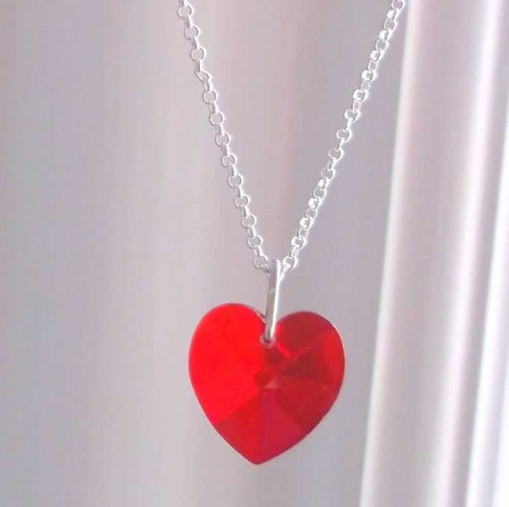 Very pretty, last two left, as from my limited edition range, A 14mm red Swarovski Crystal heart on an 18 inch sterling silver chain. Wrapped in tissue paper and in a free gift box tied with ribbon.