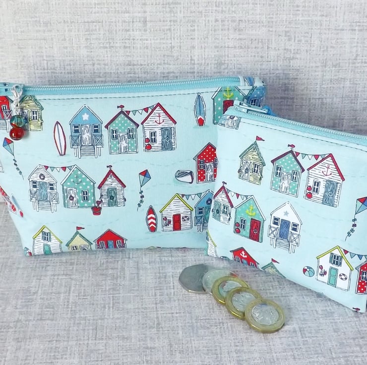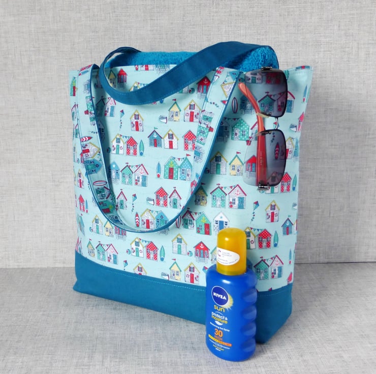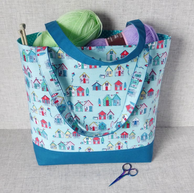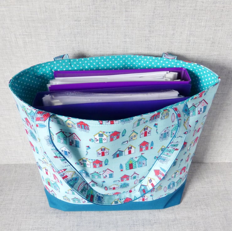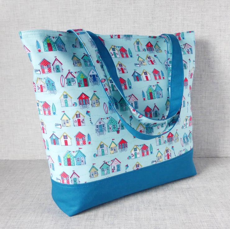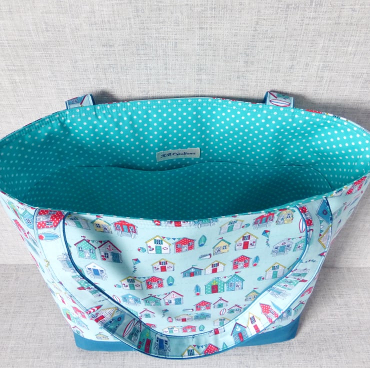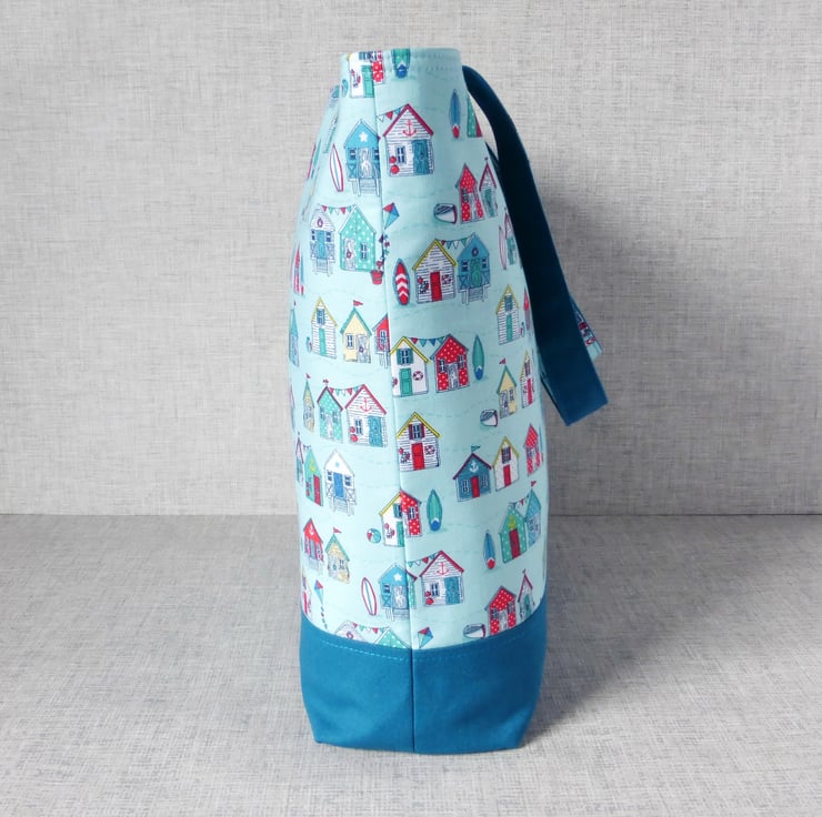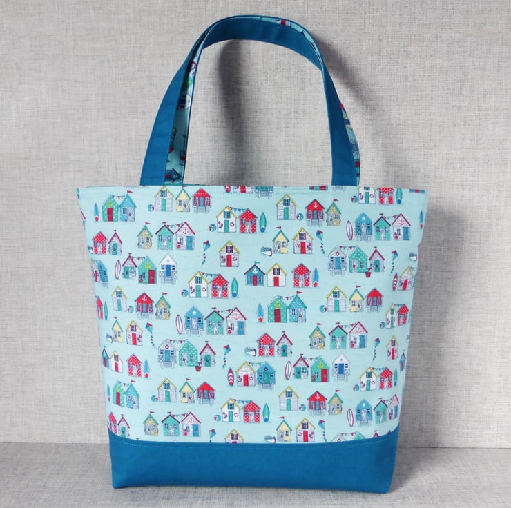 A large tote/shopping style bag made from cotton fabric with a beach huts design in shades of teal, blue & red on a turquoise background, combined with a teal coloured cotton canvas. The lining is a turquoise coloured cotton fabric with white spots on.. Inside the bag are 3 slip pockets,
