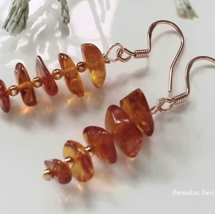 A sweet delicate pair of earrings designed for all age groups and skin tones, complimented with all rose gold vermeil (over 925 sterling silver) components. The baltic amber nuggets graduat in size and they have a beautiful natural warm golden glow. They have not had any specialist treatments applied to enhance them. These earrings will make an ideal quality affordable gift for ladies of all age groups. Baltic Amber is extremely lightweight making them ideal for long periods of wear time on a daily bases. They will come presented placed on a white glossy earring card inside a sealed clear cellophane wrapping for hygiene and inspection purposes, wrapped in bubble wrap inside a organza gift pouch.