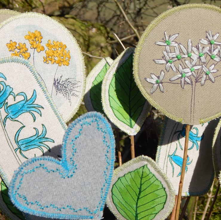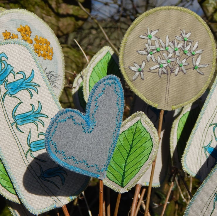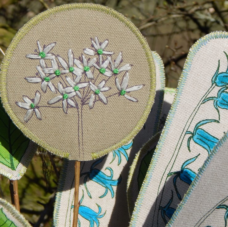 2 x wild garlic, screen printed with linen light grey petals hand embroidered, with green french knot centres