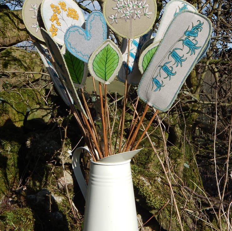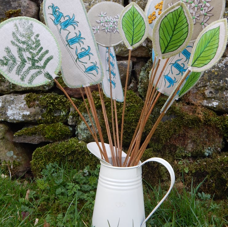 This is a bouquet of 18 fabric on willow creations. Each is double sided with interfacing for stability. They are all have running stitch and then a zig zig stitched finishing to ensure fraying is kept to a minimum. They are then hand glued onto willow which measures about 40 cm in length. Designed for use within the house.