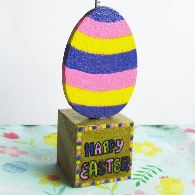 A wooden hand-carved egg shape, hand painted with acrylic paint in purple, yellow and pink stripes.