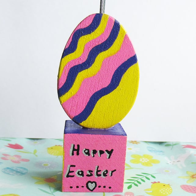 Perfect for your desk at work or home office this Easter. It sits on a wooden cube which has been painted in matching colours to the egg and the text in black and silver ' Happy Easter' added to the front with a tiny silver heart.
