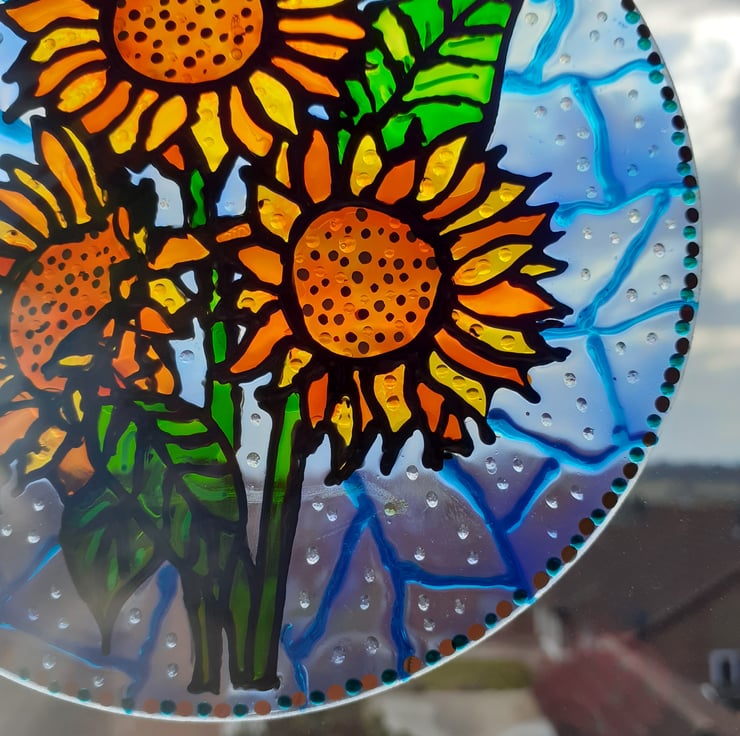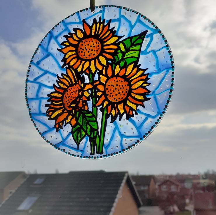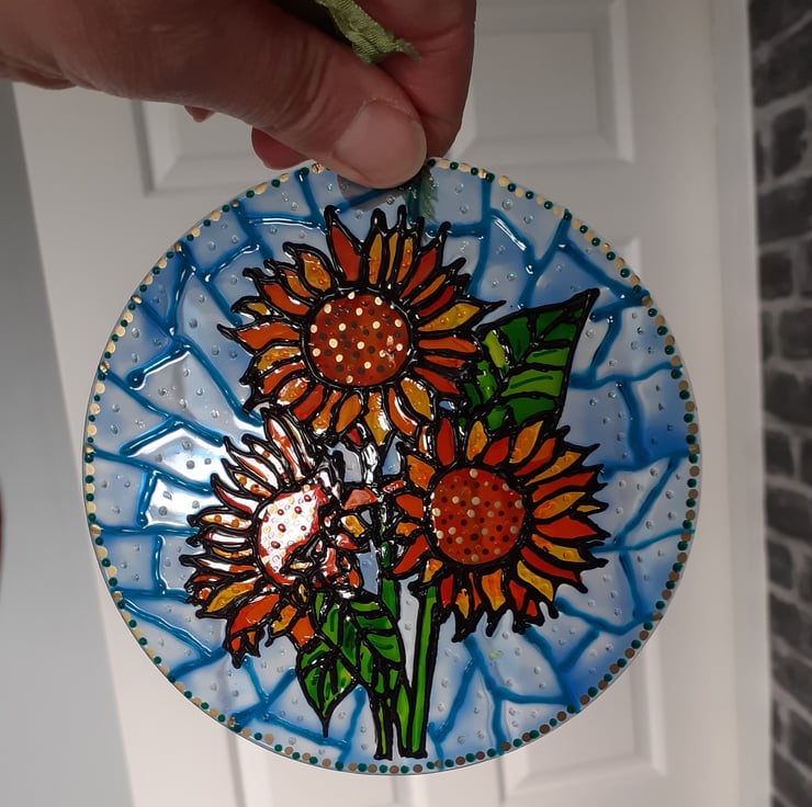 The sun flower design has been painted on to a glass panel using glass paints and out-liners. The sun-catcher hangs from a green ribbon.