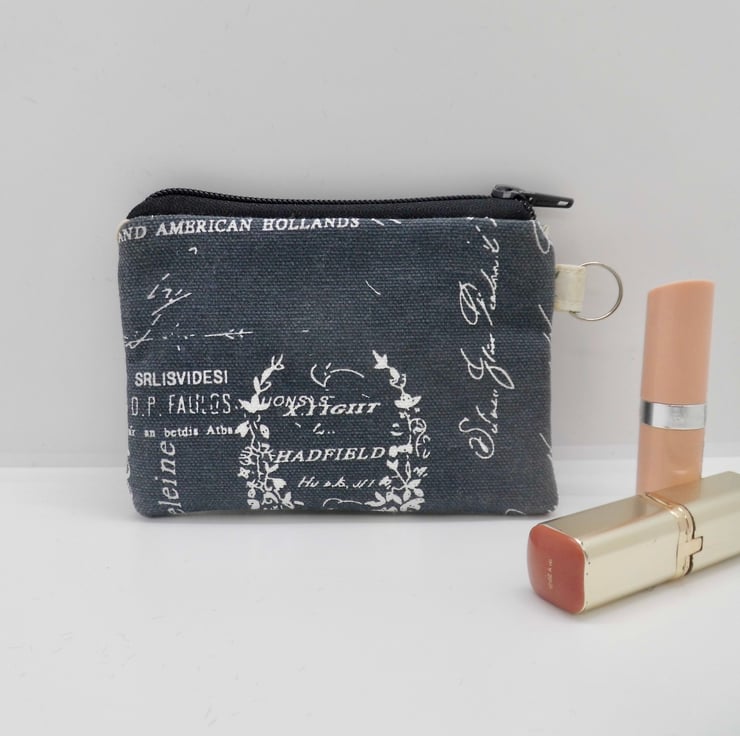 Flat style with a chunky black zip across the top.Key ring loop stitched into one side seam.