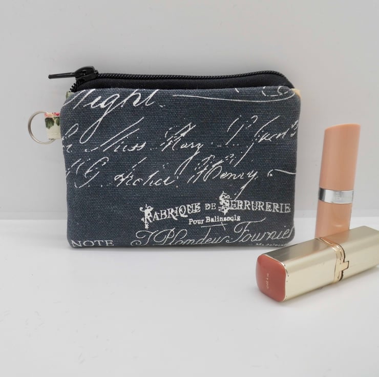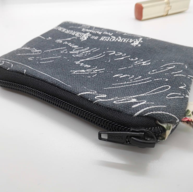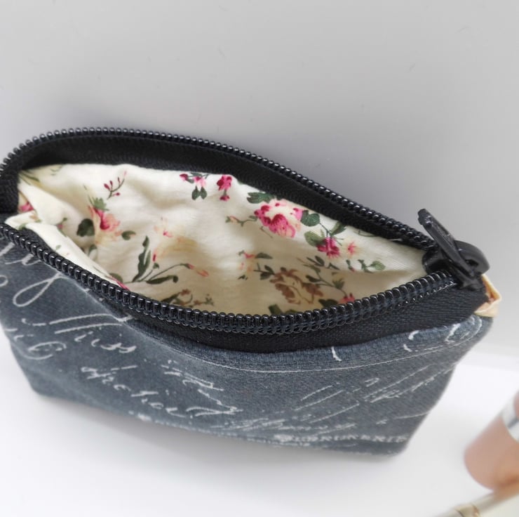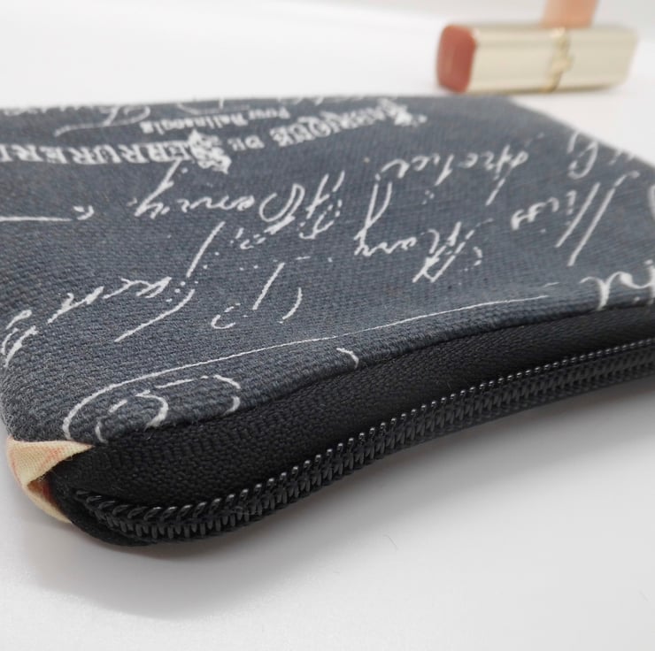 Clearance item! I made this purse with a dark grey fabric which is printed with vintage style script. The fabric is backed with fusible fleece to maintain the shape and give it a nice quality feel. Lined with a beautiful floral cotton.