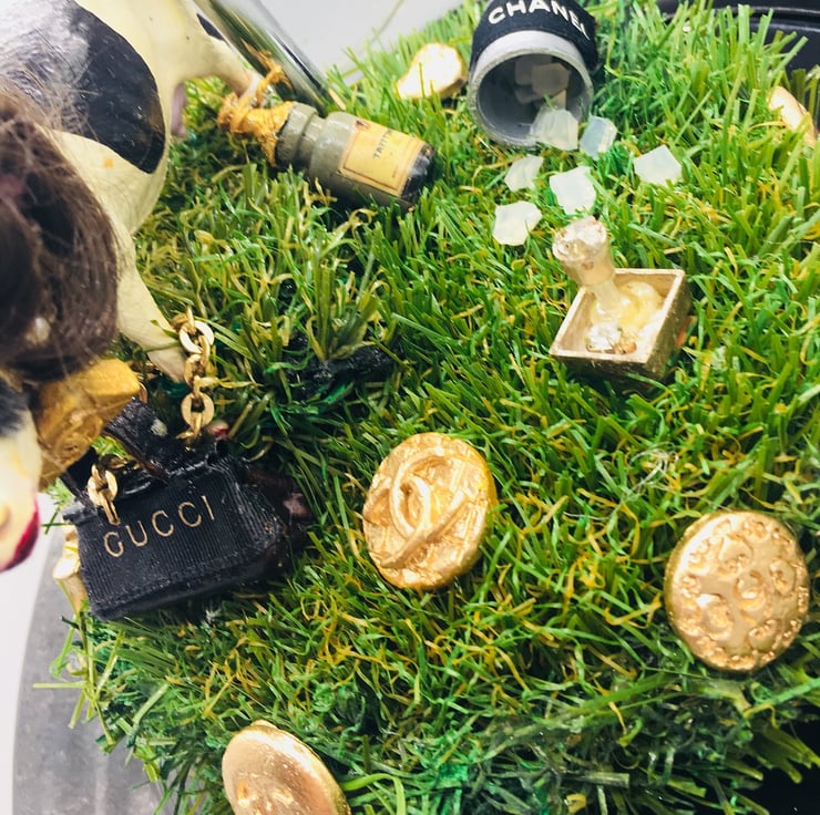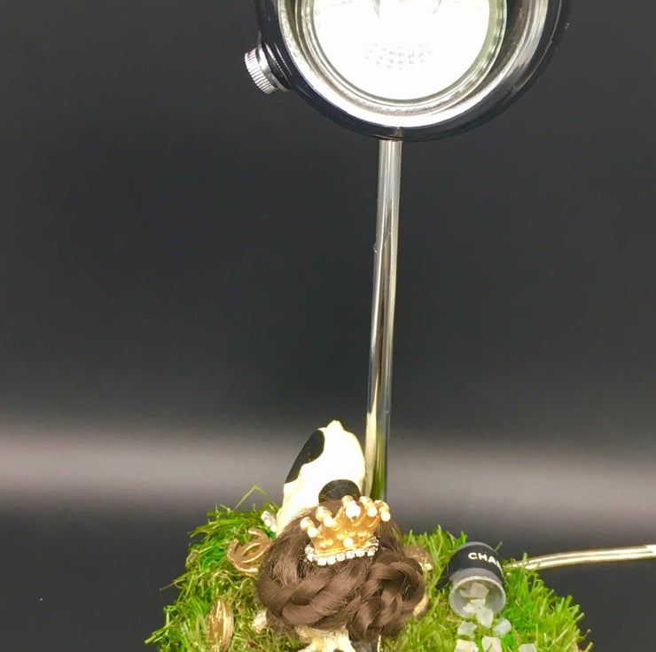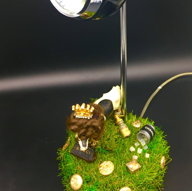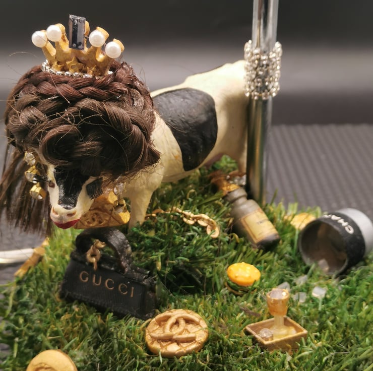 My Real Cowswife lamp is a tongue in cheek poke at The RHO series, I have designed and created all of the props. My cow stands on a grass mound and is surrounded by ceramic labels, she has her own ice bucket, champagne and ice cubes and of course her designer leather bag. Her wig, fake lashes, jewellery, painted hooves, obligatory crown and designer bell complete her understated look. I use as many repurposed materials as possible and all of my boxes and packing are 100% recycled.
