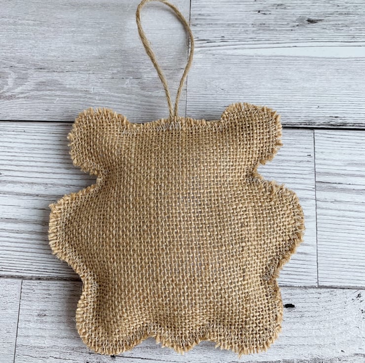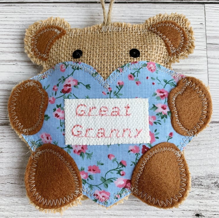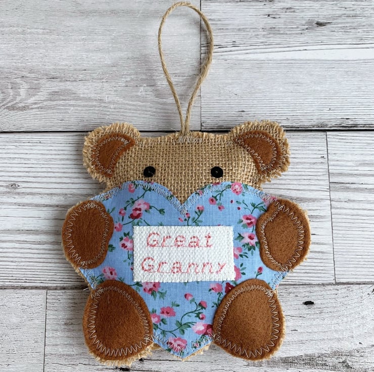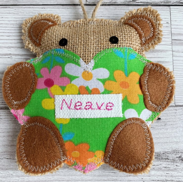 A personalised bear hug hanging decoration, made to order. This delightful Bear Hug can be personalised with a name or family name (such as Mum) and is the perfect way to send someone a hug. The bear is made from hessian and has golden brown felt paws and ears, and black sequin eyes. The bear holds a heart made from print fabric - there are 8 options to choose from (see second and third photos for fabric options). The name is machine embroidered onto a small white panel in thread of a colour to match the heart fabric (2 words max. each of 9 letters max). The bear has a jute twine hanging loop and is lightly padded with polyester hollow fibre filling, which conforms to safety regulations.