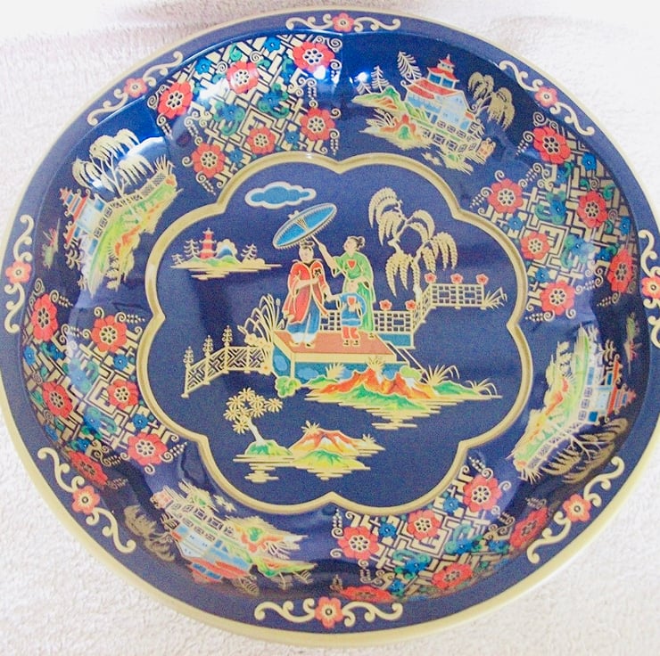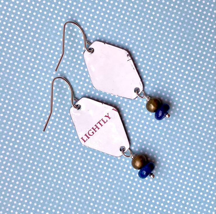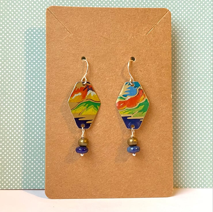 Mountain scenes are depicted in these hexagonal earrings which have been hand cut from a vintage Daher oriental themed tin dish. They have been smoothed around the edges and bead drops added which include 6mm Lapis Lazuli donut beads and 5mm bronze beads. Vibrant, colourful earrings that are a little piece of the past.