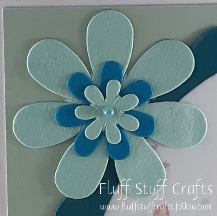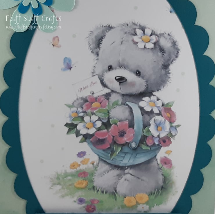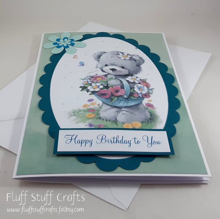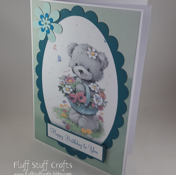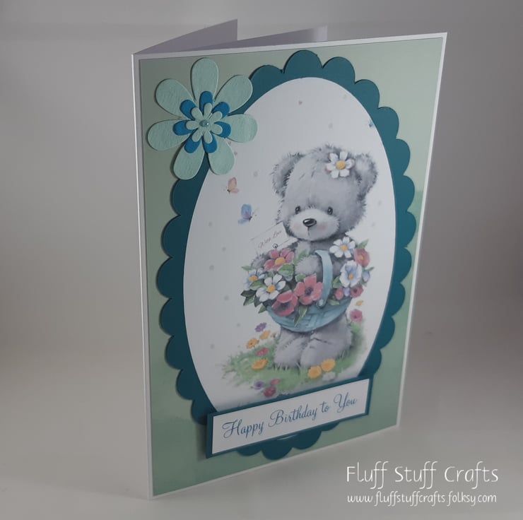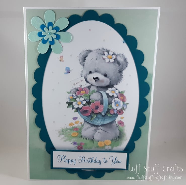 A5 birthday card featuring a cute image of a bear with a basket of flowers. The image is framed with teal, scalloped card on a pale green background. The sentiment reads: 'Happy Birthday to You' and is raised above the image. The card is embellished with coordinating paper flowers with a small pearl gem centre.