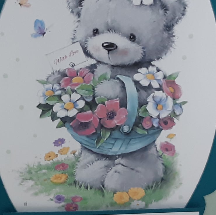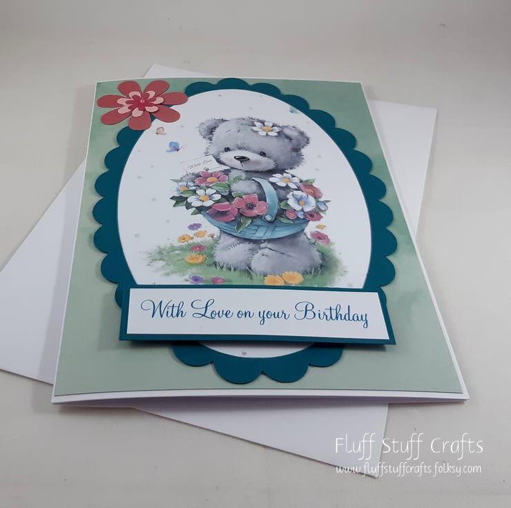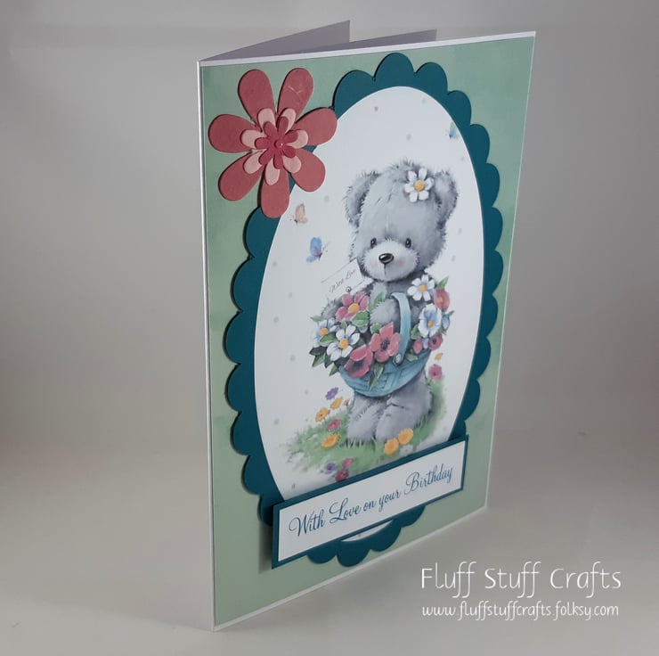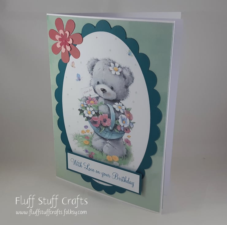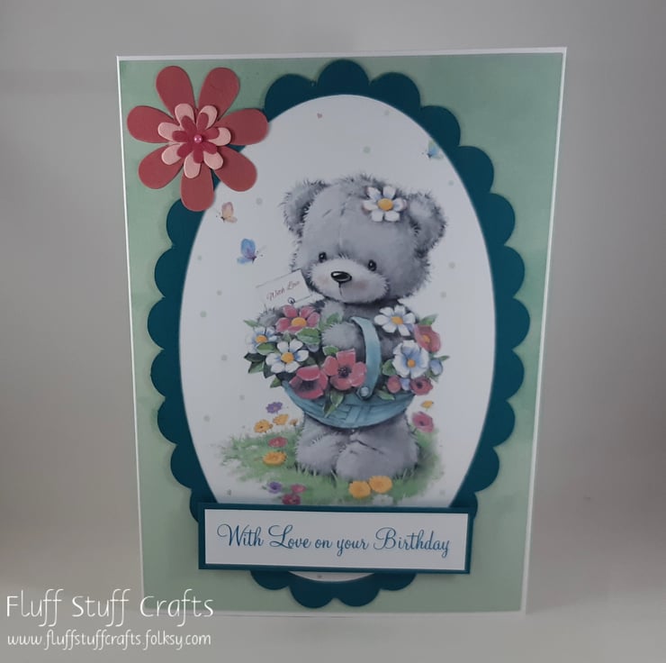 A5 birthday card featuring a cute image of a bear with a flower basket. The image has a scalloped, teal frame over a pale green background. The sentiment reads: 'With Love on your Birthday' and is layered over the image. The card is embellished with bright pink paper flowers with a small pearl gem centre.