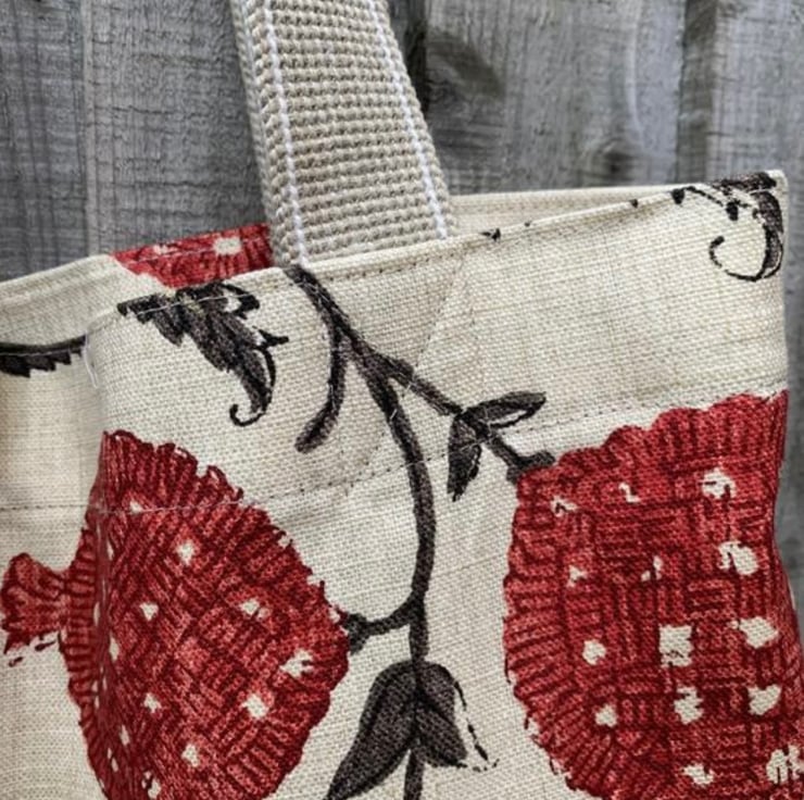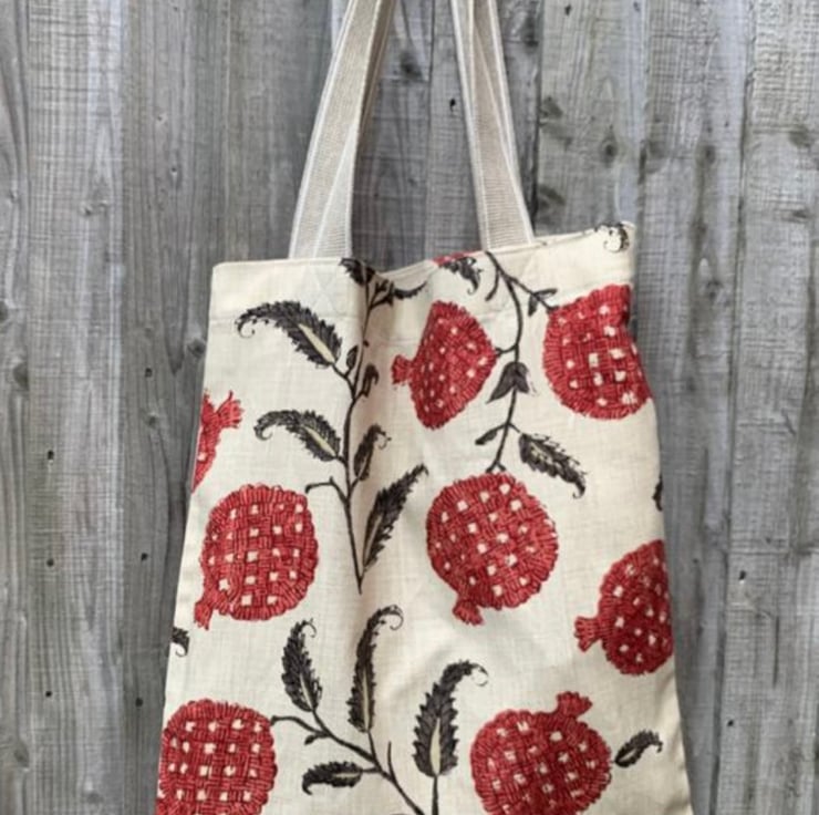 Tote bag made from Sanderson Anaar cotton/linen mix fabric printed with pomegranates. The bag has long webbing straps which can be worn on the shoulder.