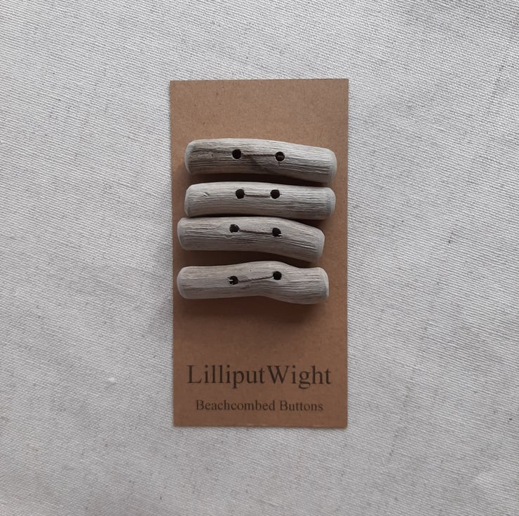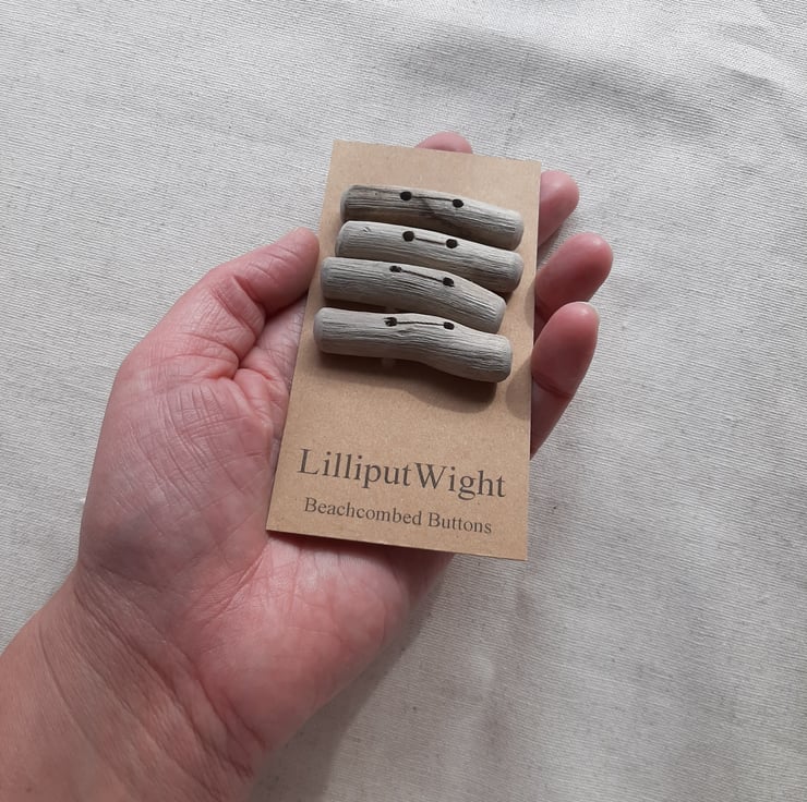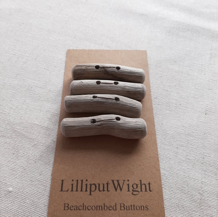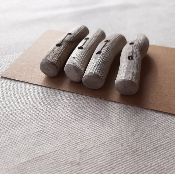 This set of four toggle style buttons has been handmade from driftwood collected from the beach close to my home on the Isle of Wight. These natural wood buttons would be perfect on a squashy garter stitch cardigan.