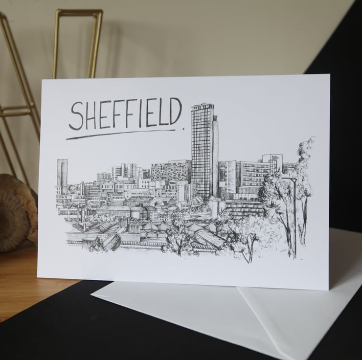 This monochrome illustration of Sheffield skyline features the city centre from South Street Park. A perfect gift for that Yorkshire lover if you need a graduation, birthday or housewarming card.