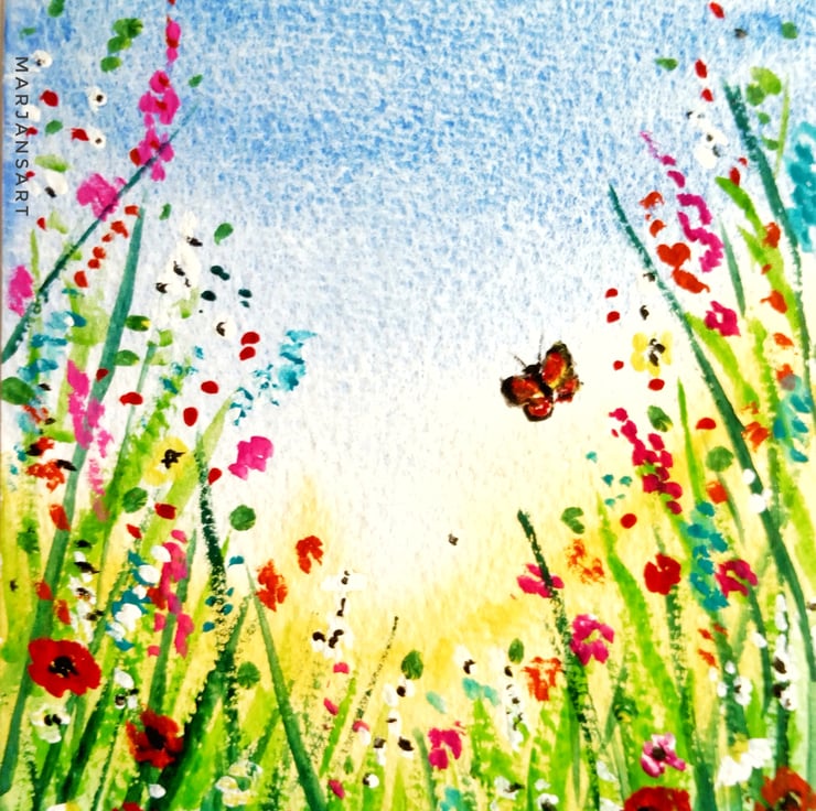 A lovely miniature original painting with a butterfly in a flower meadow. Soft background colours in blue and yellow