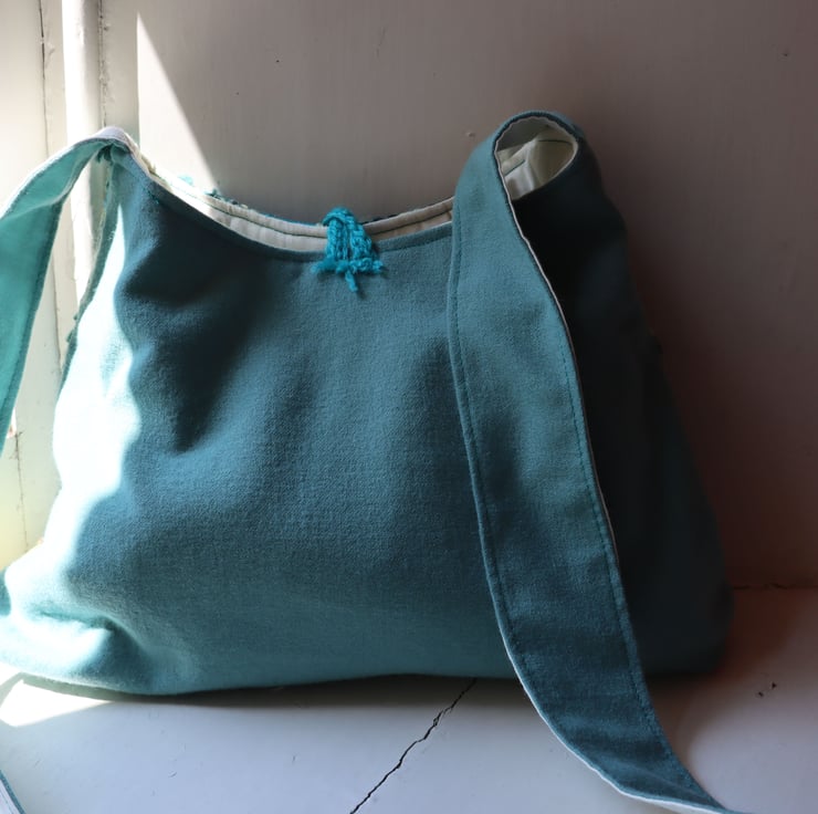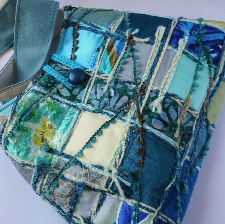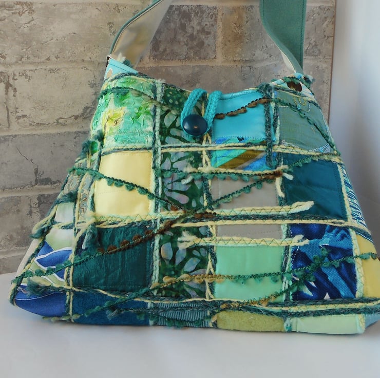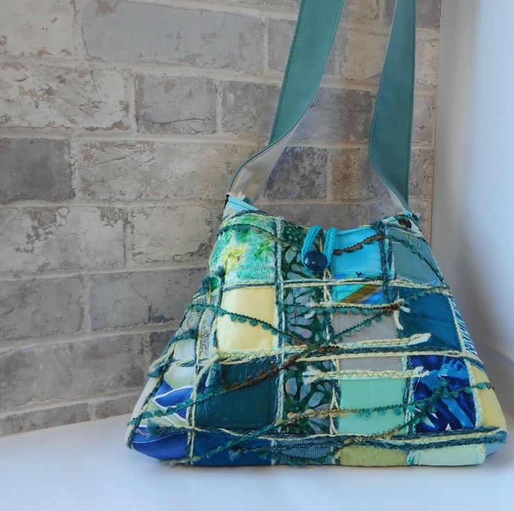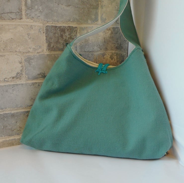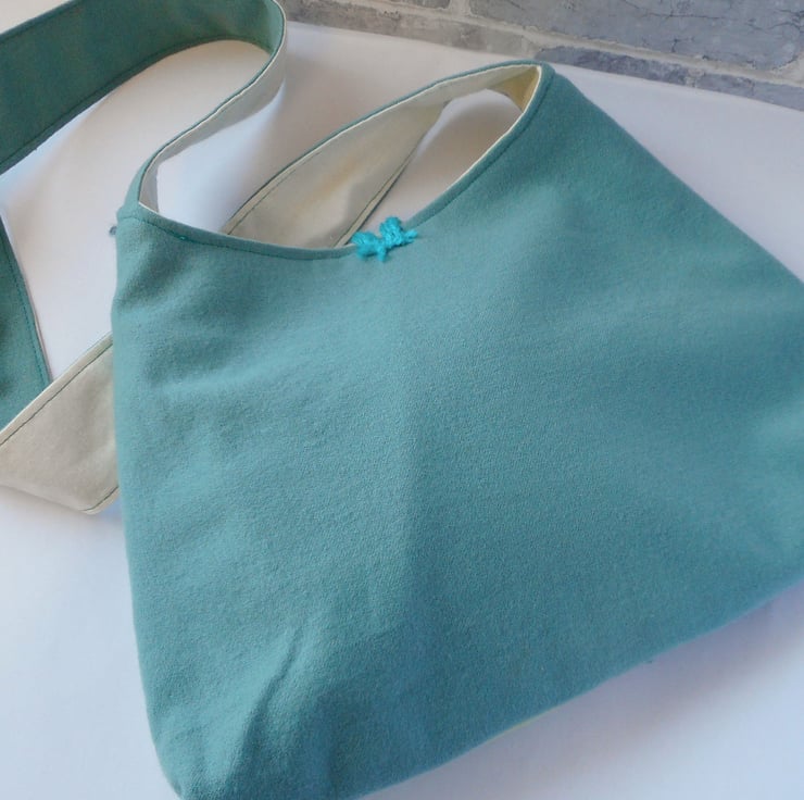 This is a soft, unstructured fabric pyramid shaped bag in various fabrics. The front is pieced together using shades of teal, aquamarine, lemon, jade and spearmint, whilst the back is made from a beautiful soft teal wool. The strap and bag are lined in an ivory cotton. The fastening is a simple crochet loop in a co-ordinating teal, with a vintage button hand stitched to the front of the bag.