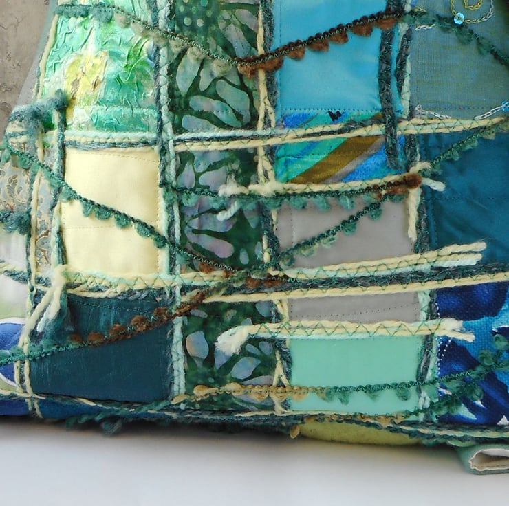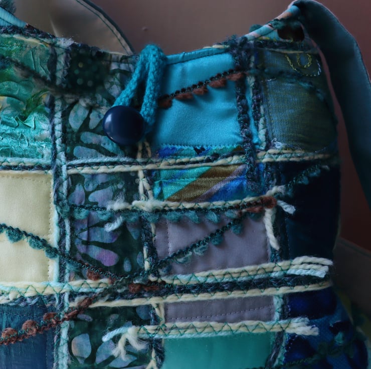 I make my feature fabrics from scraps I have left from other projects, and build up the fabric appliques with co-ordinating fancy yarns and machine embroidery. There are fluffy yarn ends, some loose edges, small details that add texture and are not faults, but a deliberate choice made during the making process. This finish is my preferred aesthetic and doesn't impact on how well made this item is. It's simply a style choice.