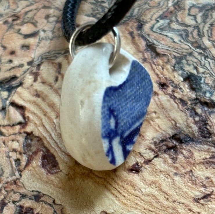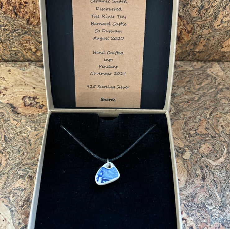 I found this little piece of pot in Thorsgill Beck leading into the river Tees, Abbey Road, Barnard Castle. Lovely August day, the stream was running low and I could see this little blue piece stuck in the sandy mud. I Love blue ceramics so scooped it up quickly and turning over the shard I saw a lovely little picture of a candle with decoration surrounding it. It’s a perfect small image, complete in itself, as if it never belonged to a plate. Since making this I’ve found other pieces and the little candle is actually a fence post, part of The Blue Willow pattern, but I still prefer to think of it as a complete image and still a candle.