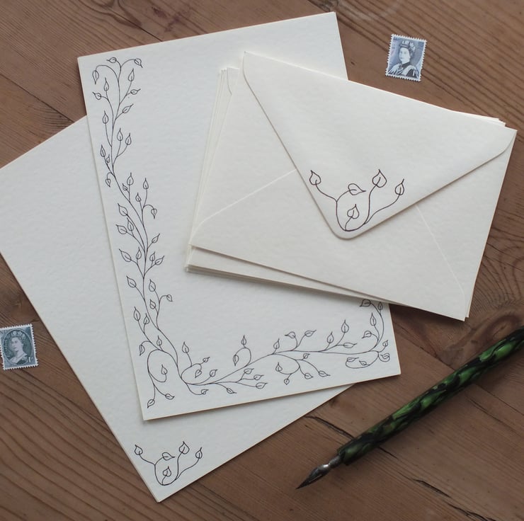 Illustrated letter paper and envelopes with original leaves design