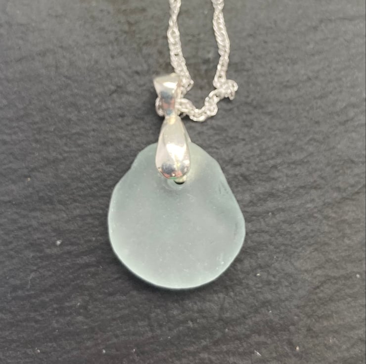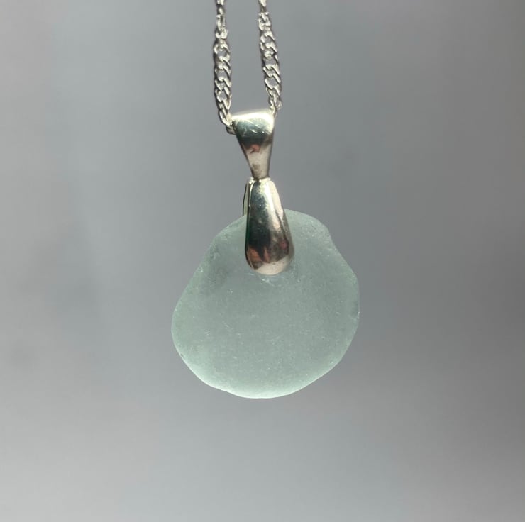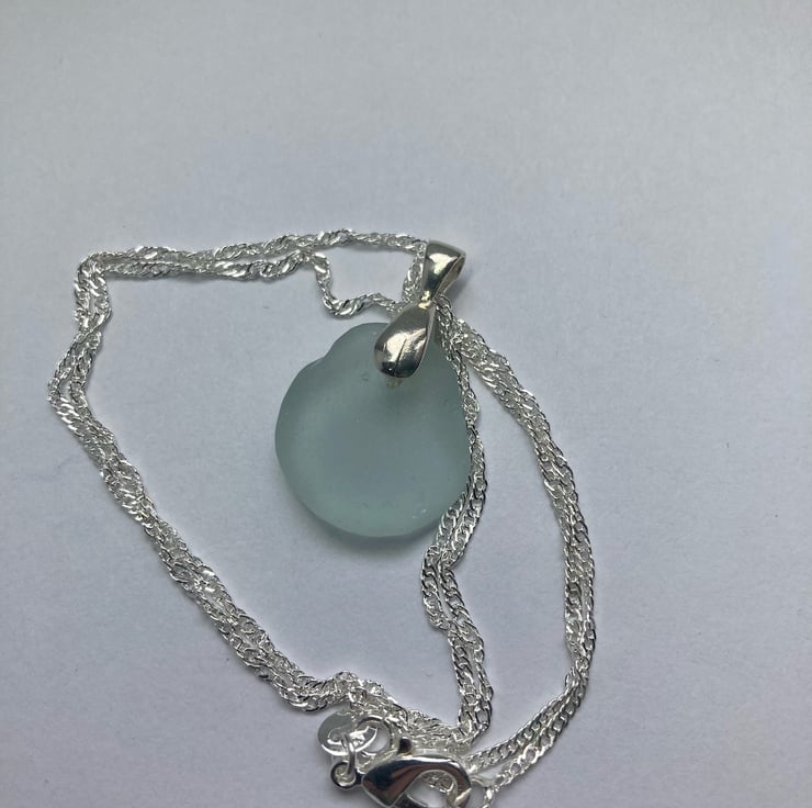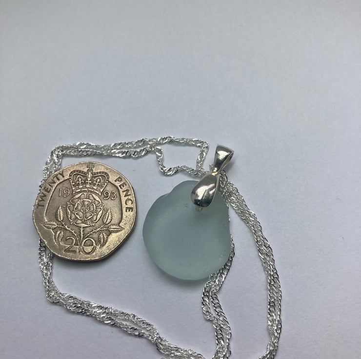 This small pale aquamarine piece of seaglass was collected from Withernsea beach. It has a silver plate mount, measures approx 2x1.8cm at its widest points and comes with an 18 inch twisted silver plate chain.