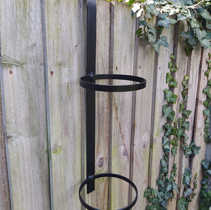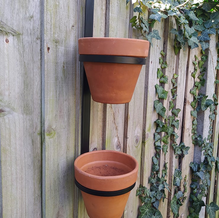 Hand made from steel, black finish double pot holder. Suitable for 6" terracotta pots. Hang along fences, balcony's , trellis's etc. move as required, in and out of sunlight. Ideal for herbs and trailing plants. Terracotta pots and plants not included. ©Urban Native Design 2018