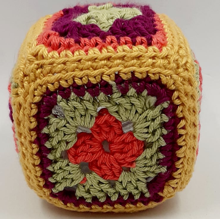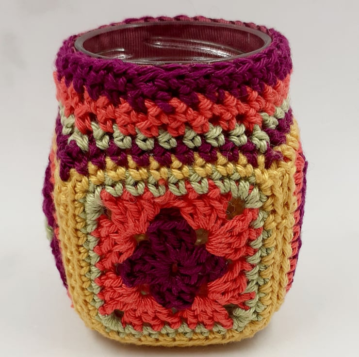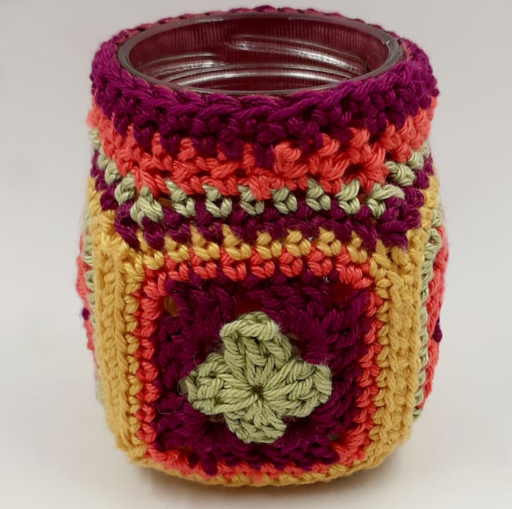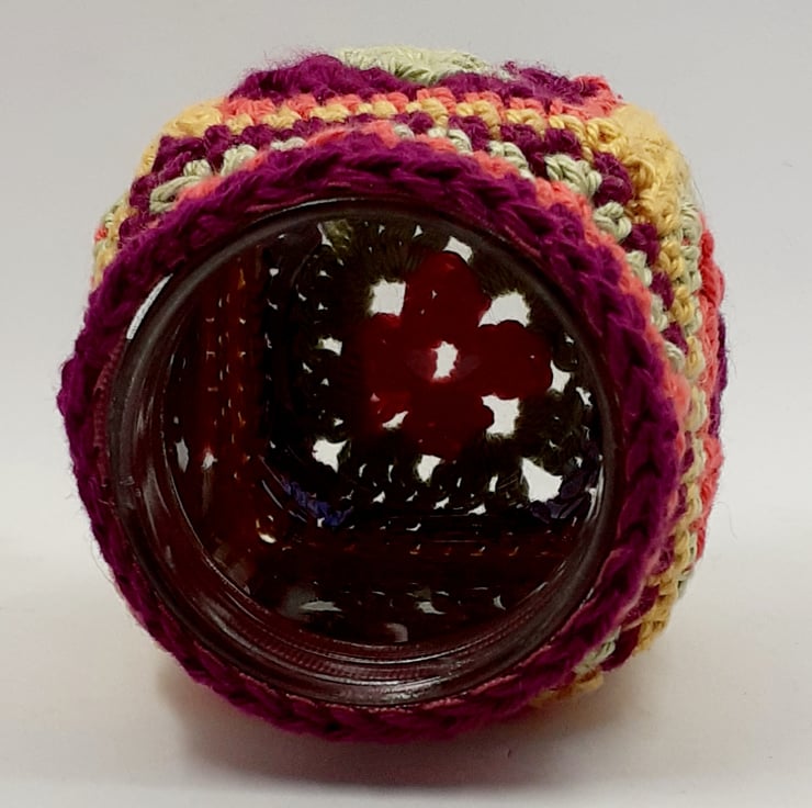 This little square glass jar has a crocheted cotton granny square cover and would make a pretty pot for holding pencils or a posy of flowers. The cover is designed not to be removable therefore care should be taken if filling it with, or emptying it of water. It would look pretty with an LED night light in it although it won't shine brightly!